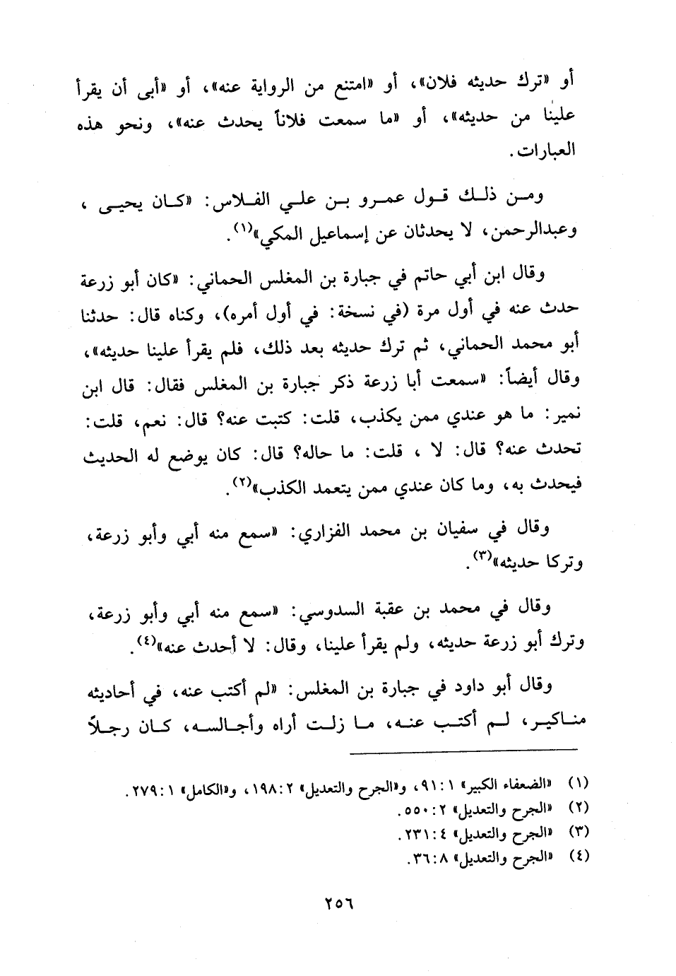 وقال ابن أبي حاتم في جُبَارَة بن المغَلِّس الحِمَّاني: "كان أبو زرعة حدث عنه في أول مرة (في نسخة: في أول أمره)، وكناه قال: حدثنا أبو محمد الحِمَّاني، ثم ترك حديثه بعد ذلك، فلم يقرأ علينا حديثه"، وقال أيضا: "سمعت أبا زرعة ذكر جُبَارَة بن المغَلِّس فقال: قال ابن نُمَيْر: ما هو عندي ممن يكذب، قلت: كتبت عنه؟ قال: نعم، قلت: تحدث عنه؟ قال: لا، قلت: ما حاله؟ قال: كان يوضع له الحديث فيحدث به، وما كان عندي ممن يتعمد الكذب" (¬٢).