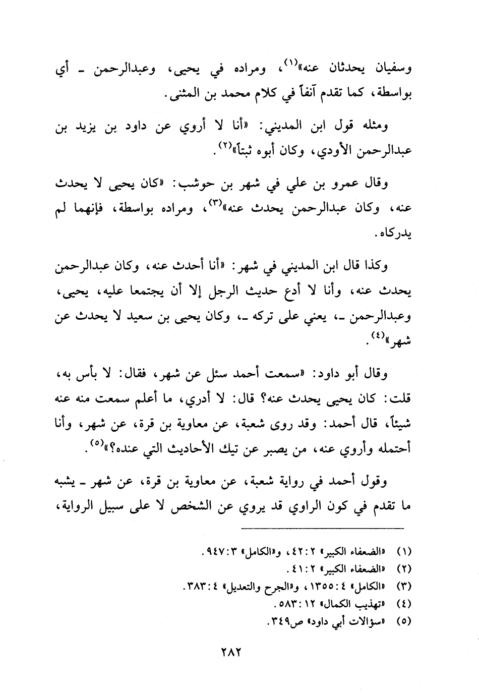 وقال عمرو بن علي في شَهْر بن حَوْشَب: "كان يحيى لا يحدث عنه، وكان عبد الرحمن يحدث عنه" (¬٣)، ومراده بواسطة، فإنهما لم يدركاه.
