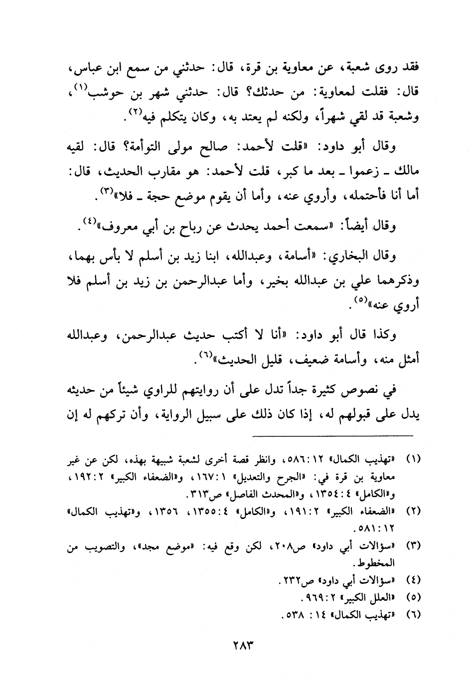 (¬١) "تهذيب الكمال"١٢: ٥٨٦، وانظر قصة أخرى لشعبة شبيهة بهذه، لكن عن غير معاوية بن قرة في: "الجرح والتعديل"١: ١٦٧، و"الضعفاء الكبير"٢: ١٩٢، و"الكامل"٤: ١٣٥٤، و"المحدث الفاصل" ص ٣١٣.