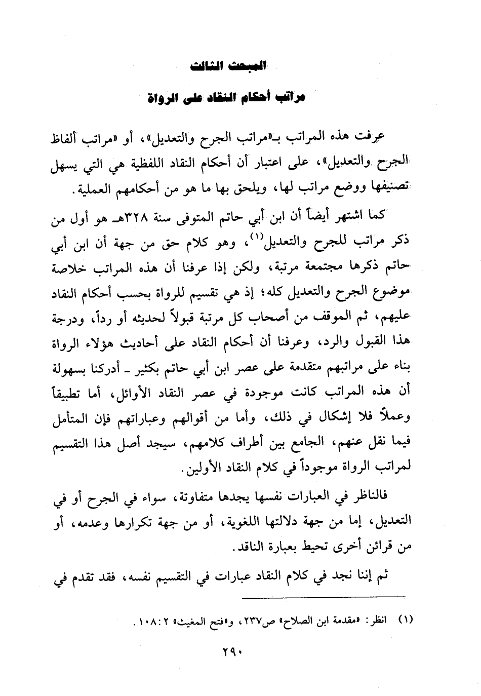 كما اشتهر أيضا أن ابن أبي حاتم المتوفى سنة ٣٢٨ هـ هو أول من ذكر مراتب للجرح والتعديل (¬١)، وهو كلام حق من جهة أن ابن أبي حاتم ذكرها مجتمعة مرتبة، ولكن إذا عرفنا أن هذه المراتب خلاصة موضوع الجرح والتعديل كله، إذ هي تقسيم للرواة بحسب أحكام النقاد عليهم، ثم الموقف من أصحاب كل مرتبة قبولا لحديثه أو ردا، ودرجة هذا القبول والرد، وعرفنا أن أحكام النقاد على أحاديث هؤلاء الرواة بناء على مرابتهم متقدمة على عصر ابن أبي حاتم بكثير- أدركنا بسهولة أن هذه المراتب كانت موجودة في عصر النقاد الأوائل، أما تطبيقا وعملا فلا إشكال في ذلك، وأما من أقوالهم وعباراتهم فإن المتأمل فيما نقل عنهم، الجامع بين أطراف كلامهم، سيجد أصل هذا التقسيم لمراتب الرواة موجودا في كلام النقاد الأولين.