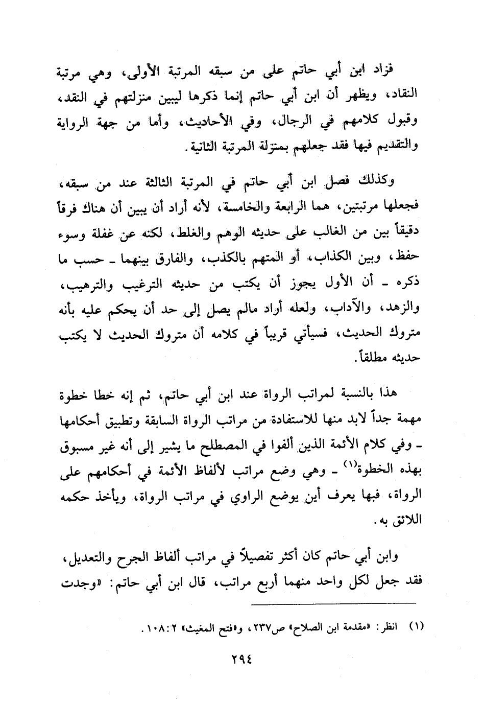 هذا بالنسبة لمراتب الرواة عند ابن أبي حاتم، ثم إنه خطا خطوة مهمة جدا لابد منها للاستفادة من مراتب الرواة السابقة وتطبيق أحكامها -وفي كلام الأئمة الذين ألفوا في المصطلح ما يشير إلى أنه غير مسبوق بهذه الخطوة (¬١) - وهي وضع مراتب لألفاظ الأئمة في أحكامهم على الرواة، فبها يعرف أين يوضع الراوي في مراتب الرواة، ويأخذ حكمه اللائق به.