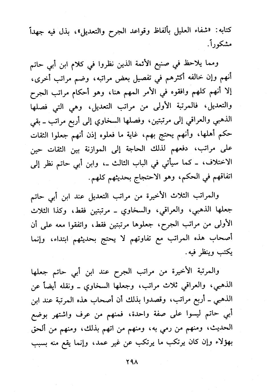 ومما يلاحظ في صنيع الأئمة الذين نظروا في كلام ابن أبي حاتم أنهم وإن خالفه أكثرهم في تفصيل بعض مراتبه، وضم مراتب أخرى، إلا أنهم كلهم وافقوه في الأمر المهم هنا، وهو أحكام مراتب الجرح والتعديل، فالمرتبة الأولى من مراتب التعديل، وهي التي فصلها الذهبي والعراقي إلى مرتبتين، وفصلها السخاوي إلى أربع مراتب- بقي حكم أهلها، وأنهم يحتج بهم، غاية ما فعلوه إذن أنهم جعلوا الثقات على مراتب، دفعهم لذلك الحاجة إلى الموازنة بين الثقات حين الاختلاف، -كما سيأتي في الباب الثالث-، وابن أبي حاتم نظر إلى اتفاقهم في الحكم، وهو الاحتجاج بحديثهم كلهم.
