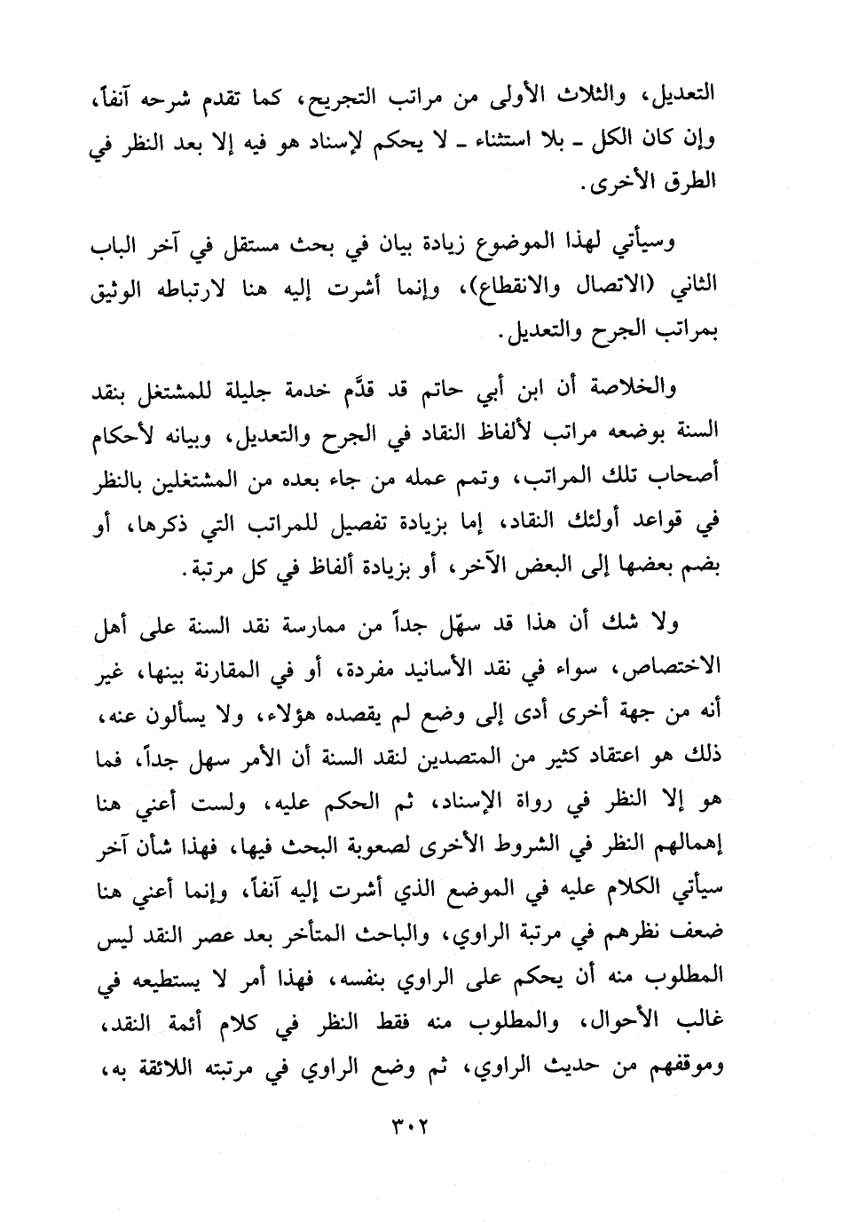 والخلاصة أن ابن أبي حاتم قد قدم خدمة جليلة للمشتغل بنقد السنة بوضعه مراتب لألفاظ النقاد في الجرح والتعديل، وبيانه لأحكام أصحاب تلك المراتب، وتمم عمله من جاء بعده من المشتغلين بالنظر في قواعد أولئك النقاد، إما بزيادة تفصيل للمراتب التي ذكرها، أو بضم بعضها إلى بعض، أو بزيادة ألفاظ في كل مرتبة.