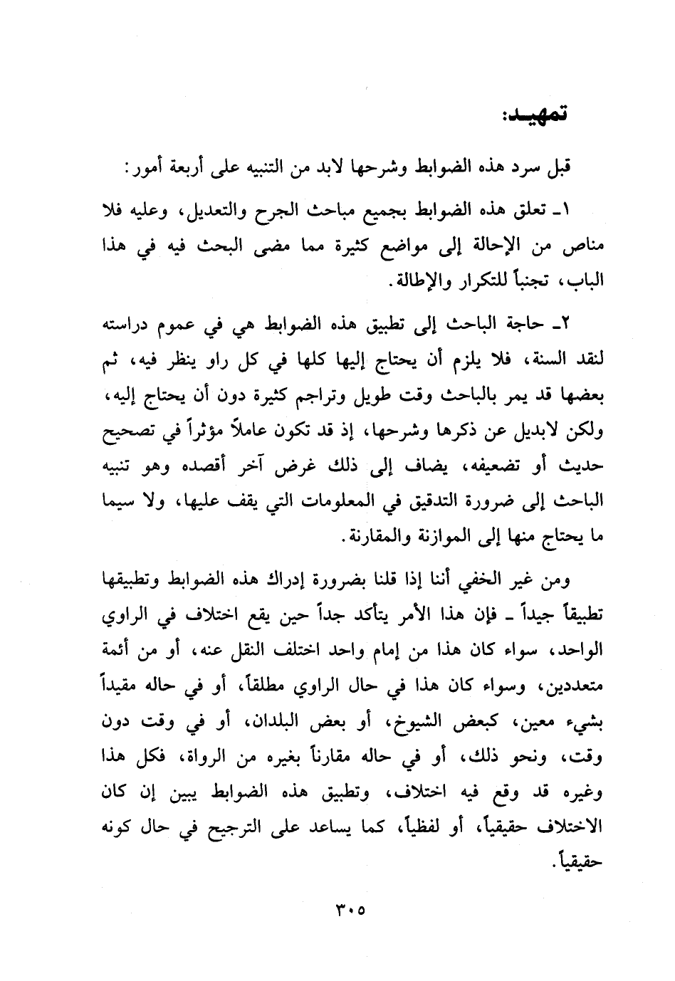 ٢ - حاجة الباحث إلى تطبيق هذه الضوابط هي في عموم دراسته لنقد السنة، فلا يلزم أن يحتاج إليها كلها في كل راو ينظر فيه، ثم بعضها قد يمر بالباحث وقت طويل وتراجم كثيرة دون أن يحتاج إليه، ولكن لا بديل عن ذكرها وشرحها، إذ قد تكون عاملا مؤثرا في تصحيح حديث أو تضعيفه، يضاف إلى ذلك غرض آخر أقصده وهو تنبيه الباحث إلى ضرورة التدقيق في المعلومات التي يقف عليها، ولا سيما ما يحتاج منها إلى الموازنة والمقارنة.