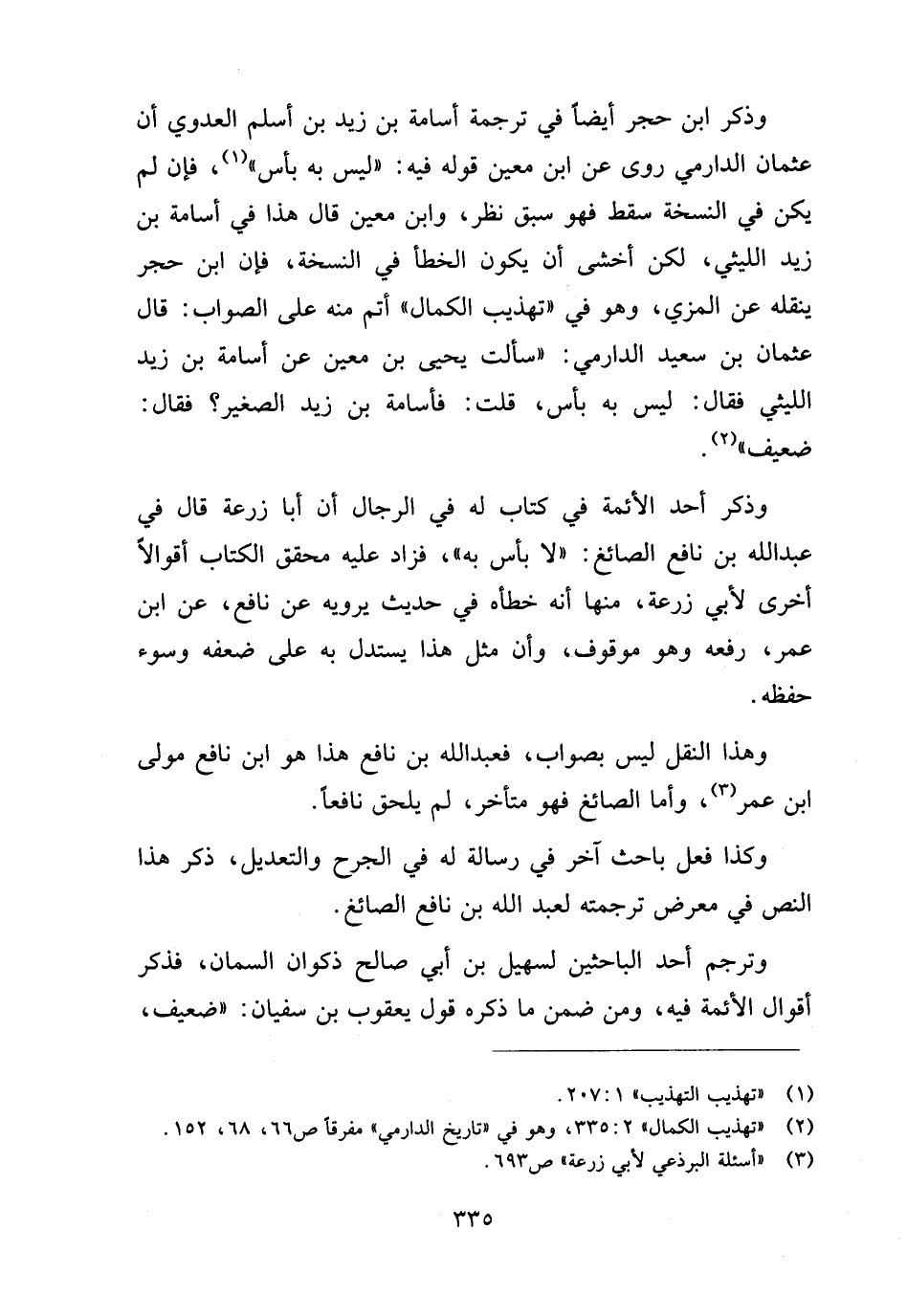 وذكر ابن حجر أيضا في ترجمة أسامة بن زيد بن أسلم العدوي، أن عثمان الدرامي روى عن ابن معين قوله فيه: "ليس به بأس" (¬١)، فإن لم يكن في النسخة سقط فهو سبق نظر، وابن معين قال هذا في أسامة بن زيد الليثي، لكن أخشى أن يكون الخطأ في النسخة، فإن ابن حجر ينقله عن المِزِّي، وهو في "تهذيب الكمال" أتم منه على الصواب: قال عثمان بن سعيد الدارمي: "سألت يحيى بن معين عن أسامة بن زيد الليثي فقال: ليس به بأس، قلت: فأسامة بن زيد الصغير؟ فقال: ضعيف" (¬٢).
