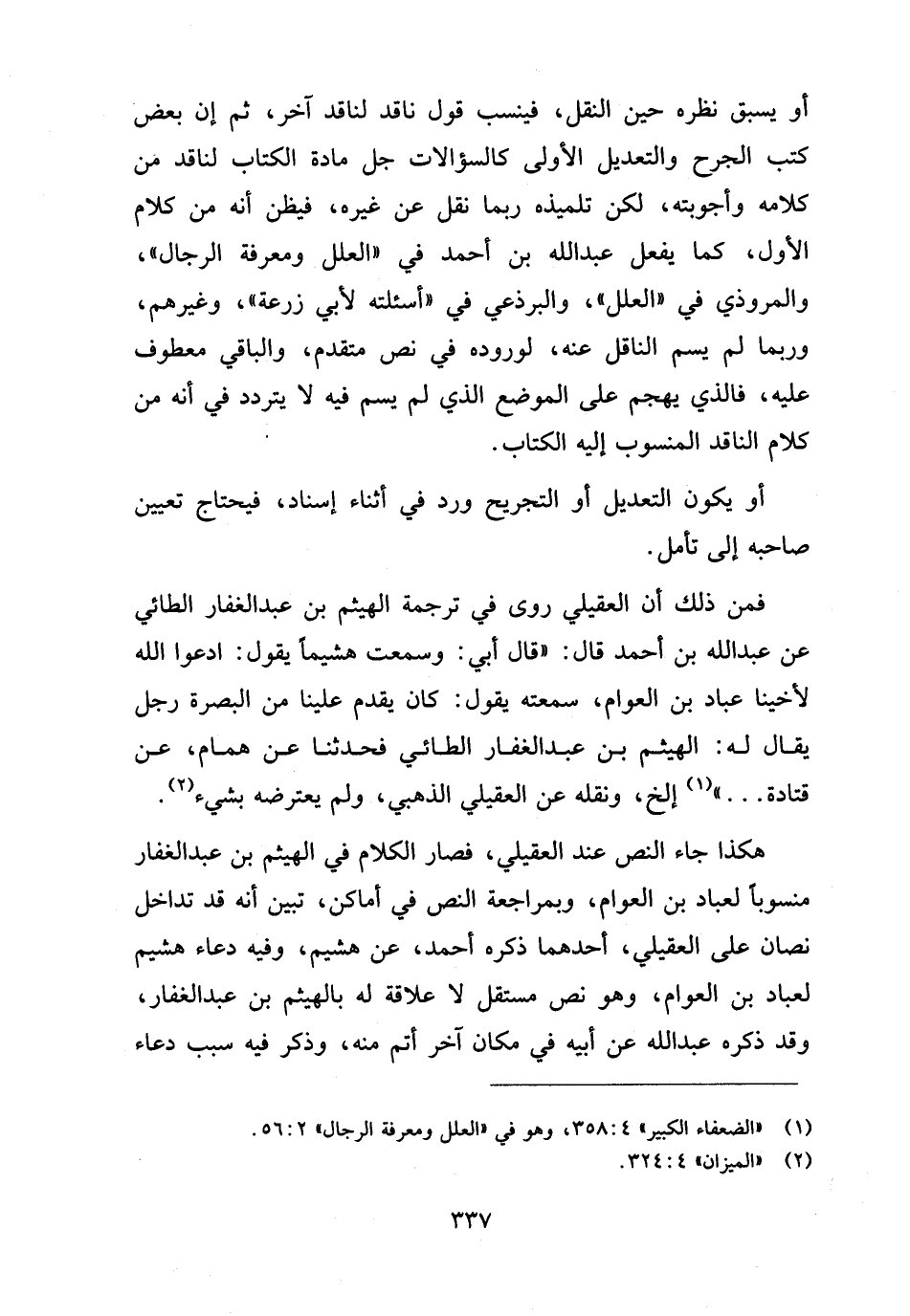 فمن ذلك أن العقيلي روى في ترجمة الهَيْثَم بن عبد الغفار الطائي عن عبد الله بن أحمد قال: "قال أبي: وسمعت هُشَيْما يقول: ادعوا الله لأخينا عباد بن العوام، سمعته يقول: كان يقدم علينا من البصرة رجل يقال له: الهَيْثَم بن عبد الغفار الطائي، فحدثنا عن همام، عن قتادة ... " (¬١) إلخ، ونقله عن العقيلي الذهبي، ولم يعترضه بشيء (¬٢).