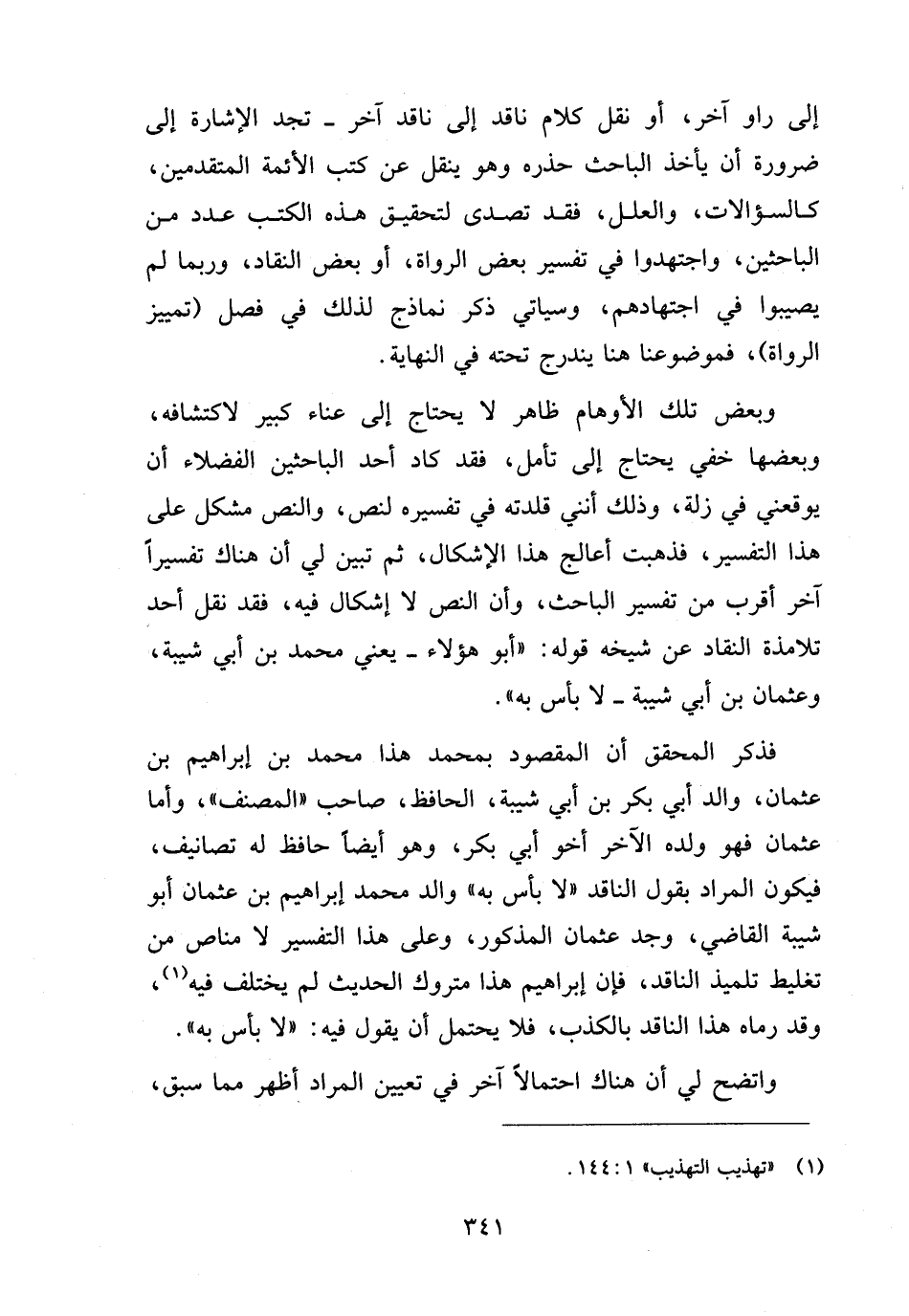 وبعض تلك الأوهام ظاهر لا يحتاج إلى عناء كبير لاكتشافه، وبعضها خفي يحتاج إلى تأمل، فقد كاد أحد الباحثين الفضلاء أن يوقعني في زلة، وذلك أنني قلدته في تفسيره لنص، والنص مشكل على هذا التفسير، فذهبت أعالج هذا الإشكال، ثم تبين لي أن هناك تفسيرا آخر أقرب من تفسير الباحث، وأن النص لا إشكال فيه، فقد نقل أحد تلامذة النقاد عن شيخه قوله: "أبو هؤلاء -يعني محمد بن أبي شيبة، وعثمان بن أبي شيبة- لا بأس به".