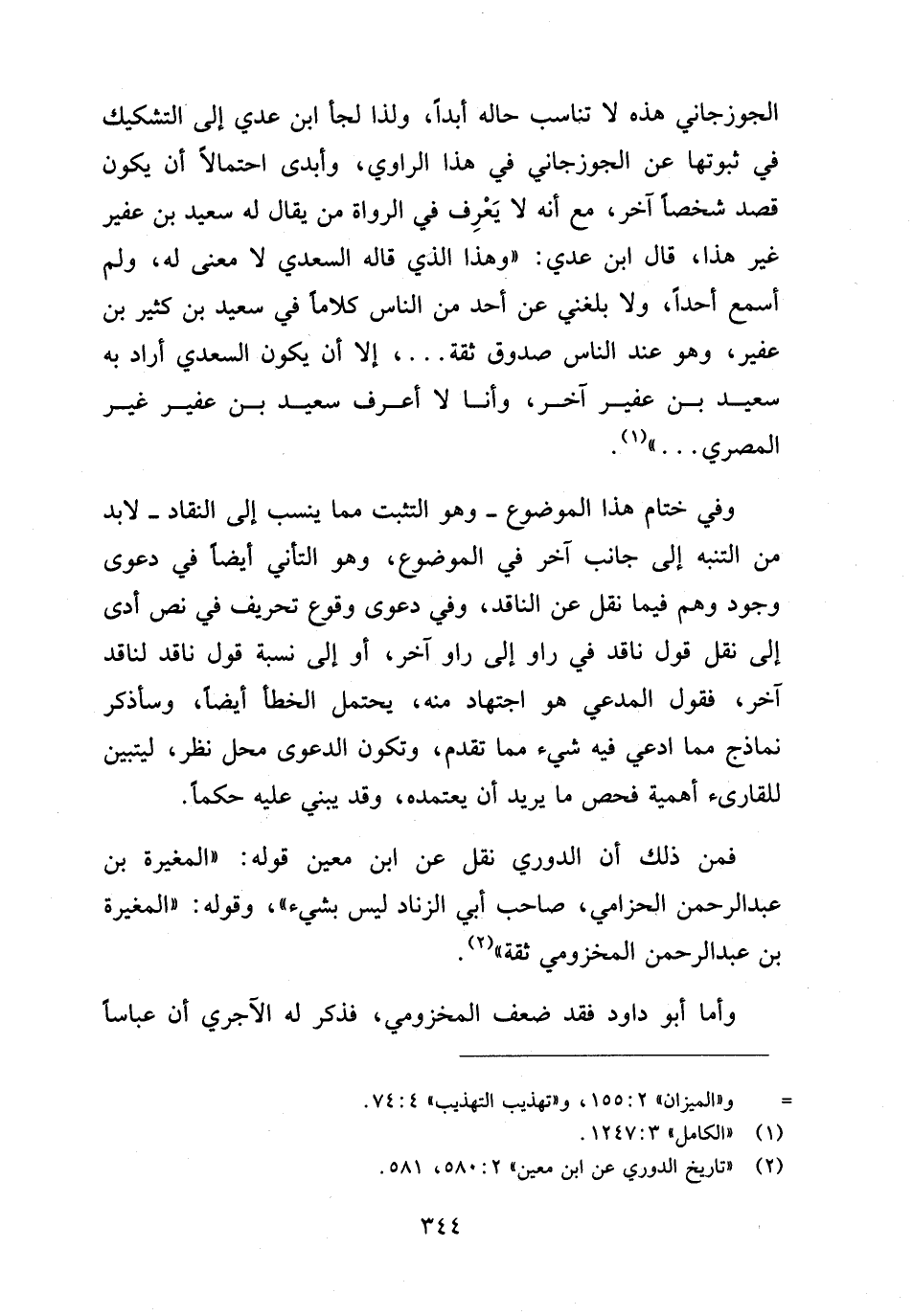 الجوزجاني هذه لا تناسب حاله أبدا، ولذا لجأ ابن عدي إلى التشكيك في ثبوتها عن الجوزجاني في هذا الراوي، وأبدى احتمالا أن يكون قصد شخصا آخر، مع أنه لا يعرف في الرواة من يقال له سعيد بن عُفَيْر غير هذا، قال ابن عدي: "وهذا الذي قاله السَّعْدي لا معنى له، ولم أسمع أحدا، ولا بلغني عن أحد من الناس كلاما في سعيد بن كثير بن عُفَيْر، وهو عند الناس صدوق ثقة ... ، إلا أن يكون السَّعْدي أراد به سعيد بن عُفَيْر آخر، وأنا لا أعرف سعيد بن عُفَيْر غير المصري ... " (¬١).