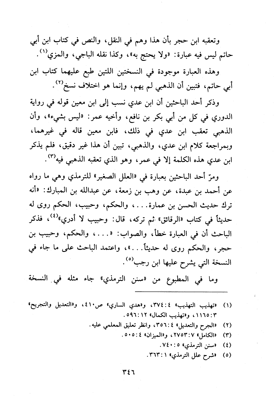 ومرّ أحد الباحثين بعبارة في "العلل الصغير" للترمذي وهي ما رواه عن أحمد بن عبدة، عن وهب بن زَمْعَة، عن عبد الله بن المبارك: "أنه ترك حديث الحسن بن عُمَارة ... ، والحكم، وحُبَيِّب، الحكم روى له حديثا في كتاب "الرقائق" ثم تركه، قال: وحُبَيِّب لا أدري (¬٣) " (¬٤)، فذكر الباحث أن في العبارة خطأ، والصواب: " .... ، والحكم، وحُبَيِّب بن حجر، والحكم روى له حديثا ... "، واعتمد الباحث على ما جاء في النسخة التي يشرح عليها ابن رجب (¬٥).