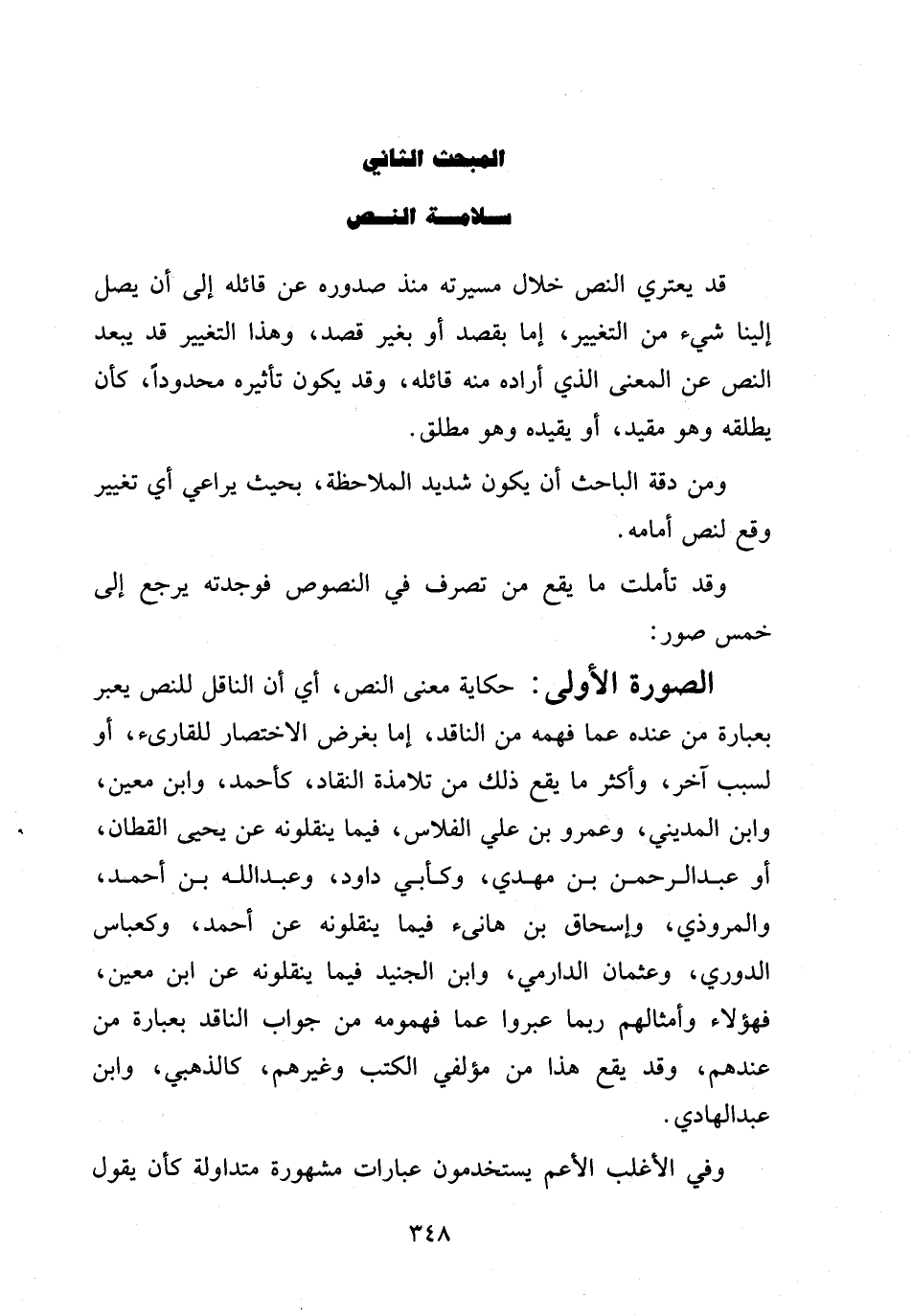 الصورة الأولى: حكاية معنى النص، أي أن الناقل للنص يعبر بعبارة من عنده عما فهمه من الناقد، إما بغرض الاختصار للقارئ، أو لسبب آخر، وأكثر ما يقع ذلك من تلامذة النقاد، كأحمد، وابن معين، وابن المديني، وعمرو بن علي الفلاس، فيما ينقلونه عن يحيى القطان، أو عبد الرحمن بن مهدي، وكأبي داود، وعبد الله بن أحمد، والمروذي، وإسحاق بن هانئ، فيما ينقلونه عن أحمد، وكعباس الدُّوري، وعثمان الدارمي، وابن الجُنَيْد، فيما ينقلونه عن ابن معين، فهؤلاء وأمثالهم ربما عبروا عما فهمومه من جواب الناقد بعبارة من عندهم، وقد يقع هذا من مؤلفي الكتب وغيرهم، كالذهبي، وابن عبد الهادي.