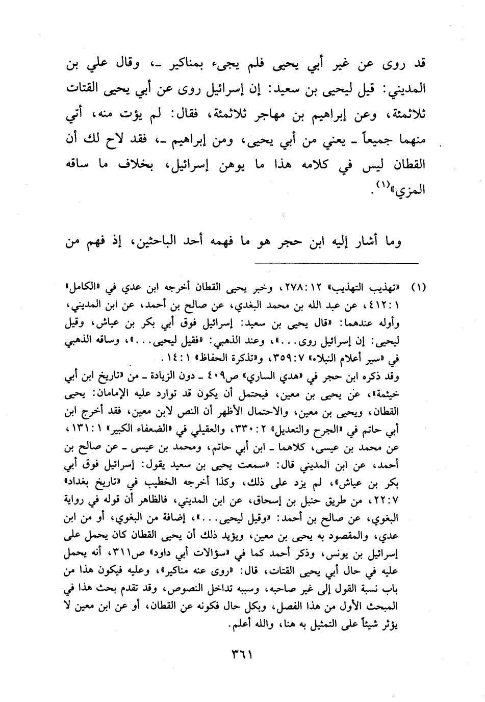 وقد ذكره ابن حجر في "هدي الساري" ص ٤٠٩ - دون الزيادة - من "تاريخ ابن أبي خيثمة"، عن يحيى بن معين، فيحتمل أن يكون قد توارد عليه الإمامان: يحيى القطان، ويحيى بن معين، والاحتمال الأظهر أن النص لابن معين، فقد أخرج ابن أبي حاتم في "الجرح والتعديل"٢: ٣٣٠، والعقيلي في "الضعفاء الكبير"١: ١٣١، عن محمد بن عيسى، كلاهما -ابن أبي حاتم، ومحمد بن عيسى -عن صالح بن أحمد، عن ابن المديني قال: "سمعت يحيى بن سعيد يقول: إسرائيل فوق أبي بكر بن عياش"، لم يزد على ذلك، وكذا أخرجه الخطيب في "تاريخ بغداد"٧: ٢٢، من طريق حنبل بن إسحاق، عن ابن المديني، فالظاهر أن قوله في رواية البغوي، عن صالح بن أحمد: "وقيل ليحيى ... "، إضافة من البغوي، أو من ابن عدي، والمقصود به يحيى بن معين، ويؤيد ذلك أن يحيى القطان كان يحمل على إسرائيل بن يونس، وذكر أحمد كما في "سؤالات أبي داود" ص ٣١١، أنه يحمل عليه في حال أبي يحيى القتات، قال: "روى عنه مناكير"، وعليه فيكون هذا من باب نسبة القول إلى غير صاحبه، وسببه تداخل النصوص، وقد تقدم بحث هذا في المبحث الأول من هذا الفصل، وبكل حال فكونه عن القطان، أو عن ابن معين لا يؤثر شيئا على التمثيل به هنا، والله أعلم.