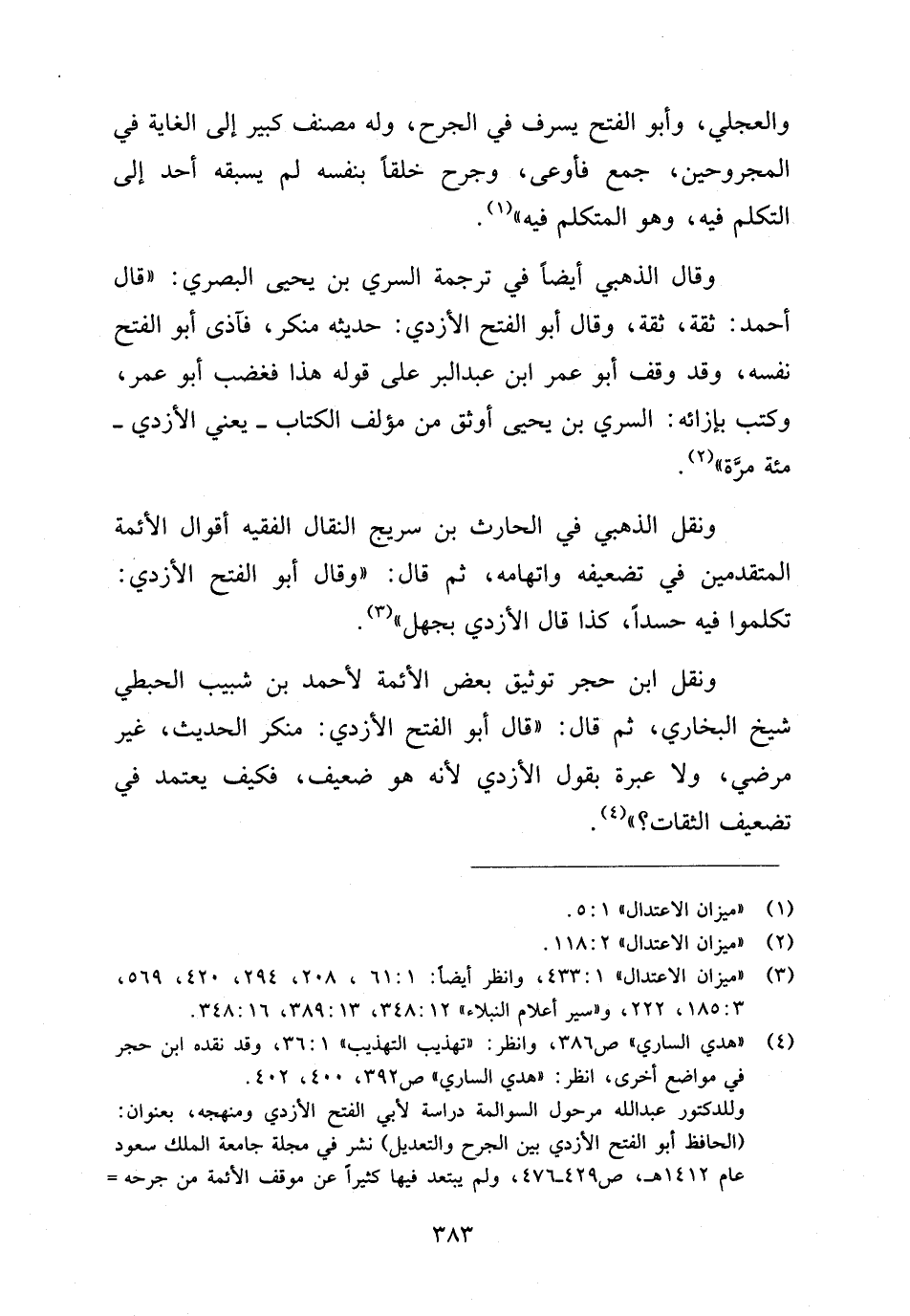 ونقل الذهبي في الحارث بن سُرَيْج النَّقَّال الفقيه أقوال الأئمة المتقدمين في تضعيفه واتهامه، ثم قال: "وقال أبو الفتح الأزدي: تكلموا فيه حسدا، كذا قال الأزدي بجهل" (¬٣).