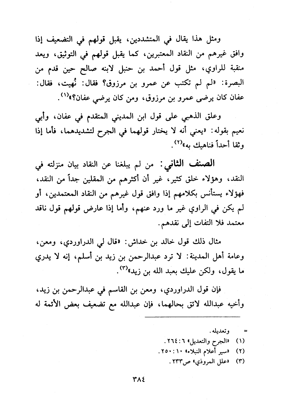 الصنف الثاني: من لم يبلغنا عن النقاد بيان منزلته في النقد، وهؤلاء خلق كثير، غير أن أكثرهم من المقلين جدا من النقد، فهؤلاء يستأنس بكلامهم إذا وافق قول غيرهم من النقاد المعتمدين، أو لم يكن في الراوي غير ما ورد عنهم، وأما إذا عارض قولهم قول ناقد معتمد فلا التفات إلى نقدهم.