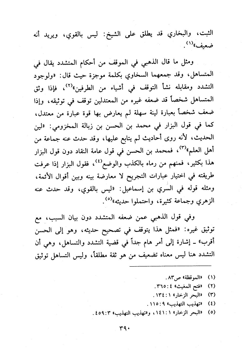 ومثل ما قال الذهبي في الموقف من أحكام المتشدد يقال في المتساهل، وقد جمعهما السخاوي بكلمة موجزة حيث قال: "ولوجود التشدد ومقابله نشأ التوقف في أشياء من الطرفين" (¬٢)، فإذا وثق المتساهل شخصا قد ضعفه غيره من المعتدلين توقف في توثيقه، وإذا ضعف شخصا قد ضعفه غيره من المعتدلين توقف في توثيقه، وإذا ضعف شخصا بعبارة لينة سهلة لم يعارض بها قوة عبارة من معتدل، كما في قول البزار في محمد بن الحسن بن زَبَالة المخزومي: "لين الحديث، لأنه روى أحاديث لم يتابع عليها، وقد حدث عنه جماعة من أهل العلم" (¬٣)، فمحمد بن الحسن في قول عامة النقاد دون قول البزار هذا بكثير، فمنهم من رماه بالكذب والوضع (¬٤)، فقول البزار إذا عرفت طريقته في اختيار عبارات التجريح لا معارضة بينه وبين أقوال الأئمة، ومثله قوله في السَّرِي بن إسماعيل: "ليس بالقوي، وقد حدث عنه الزهري وجماعة كثيرة، واحتملوا حديثه" (¬٥).