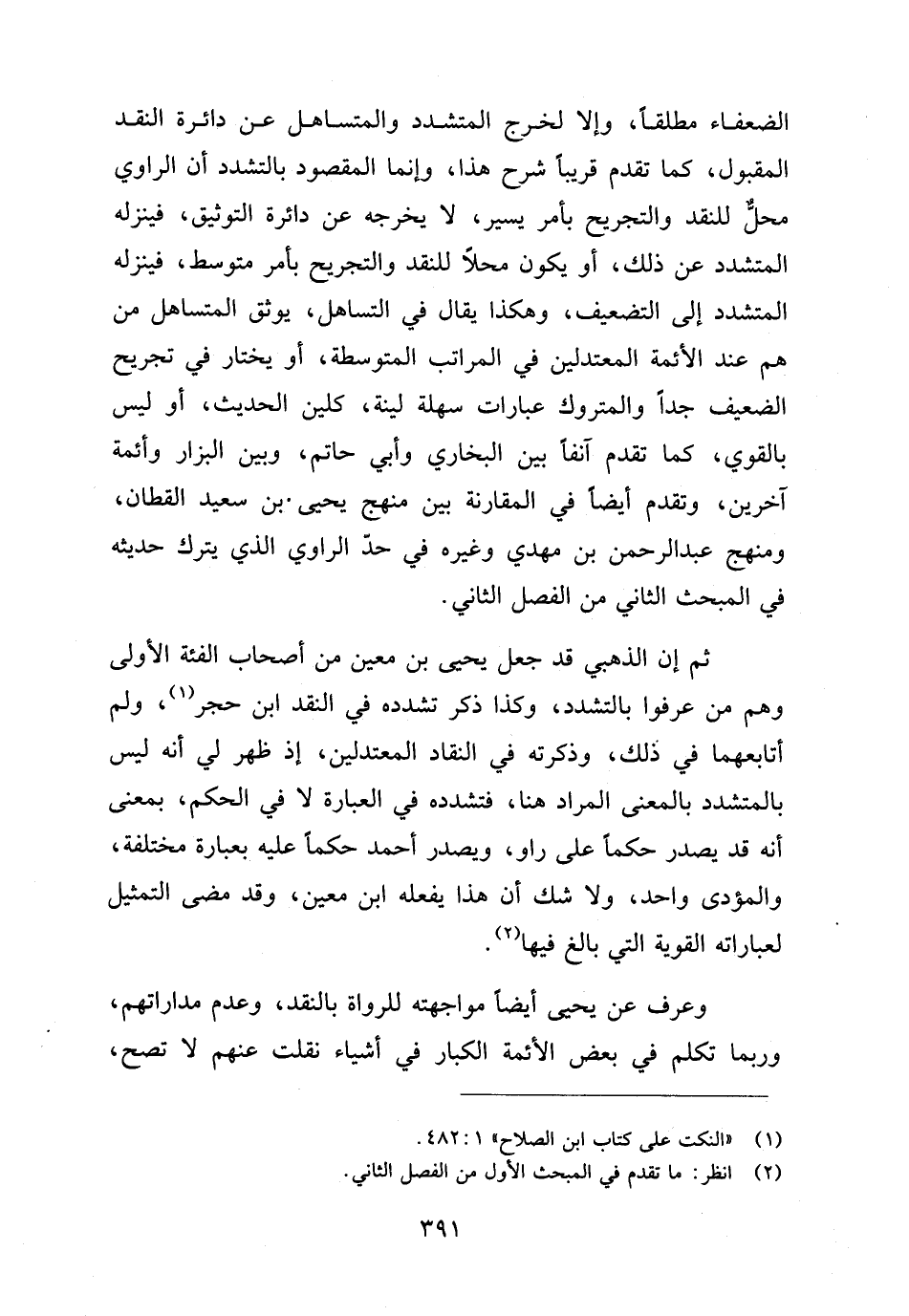 ثم إن الذهبي قد جعل يحيى بن معين من أصحاب الفئة الأولى وهم من عرفوا بالتشدد، وكذا ذكر تشدده في النقد ابن حجر (¬١)، ولم أتابعهما في ذلك، وذكرته في النقاد المعتدلين، إذ ظهر لي أنه ليس بالمتشدد بالمعنى المراد هنا، فتشدده في العبارة لا في الحكم، بمعنى أنه قد يصدر حكما على راو، ويصدر أحمد حكما عليه بعبارة مختلفة، والمؤدى واحد، ولا شك أن هذا يفعله ابن معين، وقد مضى التمثيل لعباراته القوية التي بالغ فيها (¬٢).