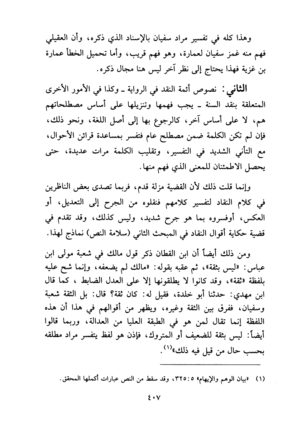ومن ذلك أيضا أن ابن القطان ذكر قول مالك في شعبة مولى ابن عباس: "ليس بثقة"، ثم عقبه بقوله: "مالك لم يضعفه، وإنما شح عليه بلفظة "ثقة"، وقد كانوا لا يطلقونها إلا على العدل الضابط، كما قال ابن مهدي: حدثنا أبو خَلْدة، فقيل له: كان ثقة؟ قال: بل الثقة شعبة، وسفيان، ففرق بين الثقة وغيره، ويظهر من أقوالهم في هذا أن هذه اللفظة إنما تقال لمن هو في الطبقة العليا من العدالة، وربما قالوا أيضا: ليس بثقة للضعيف أو المتروك، فإذن هو لفظ يَتَفَسَّر مراد مطلقه بحسب حال من قيل فيه ذلك" (¬١).
