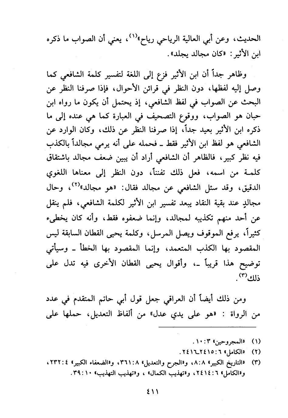 وظاهر جدا أن ابن الأثير فزع إلى اللغة لتفسير كلمة الشافعي كما وصل إليه لفظها، دون النظر في قرائن الأحوال، فإذا صرفنا النظر عن البحث عن الصواب في لفظ الشافعي، إذ يحتمل أن يكون ما رواه ابن حبان هو الصواب، ووقوع التصحيف في العبارة كما هي عنده إلى ما ذكره ابن الأثير قريب جدا، إذا صرفنا النظر عن ذلك، وكان الوارد عن الشافعي هو لفظ ابن الأثير فقط، فحمله على أنه يرمي مُجَالِدا بالكذب فيه نظر كبير، فالظاهر أن الشافعي أراد أن يبين ضعف مُجَالِد باشتقاق كلمة من اسمه، فعل ذلك تفننا، دون النظر إلى معناها اللغوي الدقيق، وقد سئل الشافعي عن مُجَالِد فقال: "هو مُجَالِد" (¬٢)، وحال مجالدٍ عند بقية النقاد يبعد تفسير ابن الأثير لكلمة الشافعي، فلم ينقل عن أحد منهم تكذيبه لمجَالِد، وإنما ضعفوه فقط، وأنه كان يخطئ كثيرا، يرفع الموقوف ويصل المرسل، وكلمة يحيى القطان السابقة ليس المقصود بها الكذب المتعمد، وإنما المقصود بها الخطأ -وسيأتي توضيح هذا قريبا-، وأقوال يحيى القطان الأخرى فيه تدل على ذلك (¬٣).