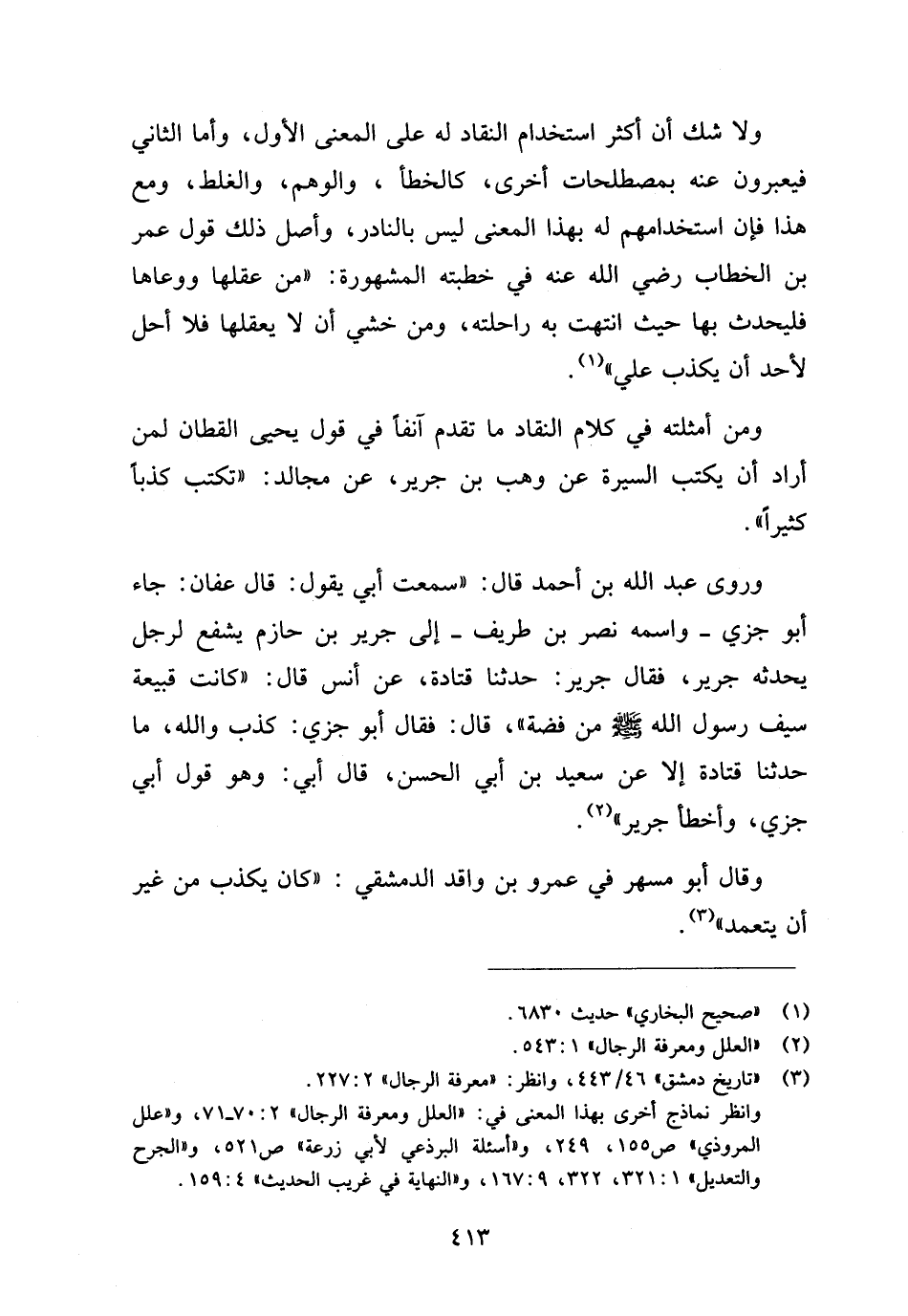 ولا شك أن أكثر استخدام النقاد له على المعنى الأول، وأما الثاني فيعبرون عنه بمصطلحات أخرى، كالخطأ، والوهم، والغلط، ومع هذا فإن استخدامهم له بهذا المعنى ليس بالنادر، وأصل ذلك قول عمر بن الخطاب رضي الله عنه في خطبته المشهورة: "من عقلها ووعاها فليحدث بها حيث انتهت به راحلته، ومن خشي أن لا يعقلها فلا أحل لأحد أن يكذب علي" (¬١).