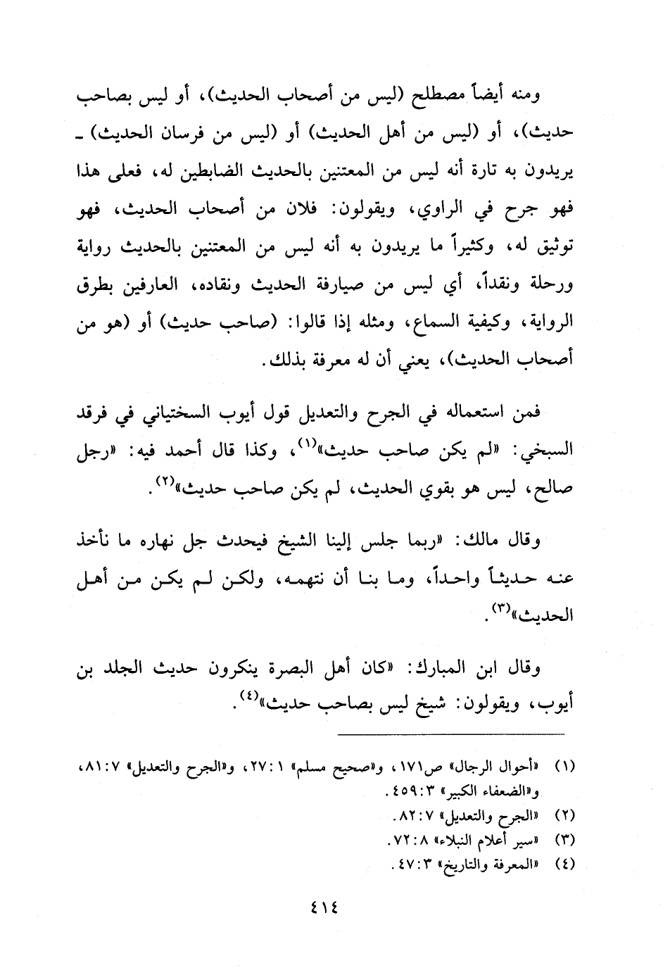 ومنه أيضا مصطلح (ليس من أصحاب الحديث)، أو (ليس بصاحب حديث)، أو (ليس من أهل الحديث) أو (ليس من فرسان الحديث) - يريدون به تارة أنه ليس من المعتنين بالحديث الضابطين له، فعلى هذا فهو جرح في الراوي، ويقولون: فلان من أصحاب الحديث، فهو توثيق له، وكثيرا ما يريدون به أنه ليس من المعتنين بالحديث رواية ورحلة ونقدا، أي ليس من صيارفة الحديث ونقاده، العارفين بطرق الرواية، وكيفية السماع، ومثله إذا قالوا: (صاحب حديث) أو (هو من أصحاب الحديث)، يعني أن له معرفة بذلك.