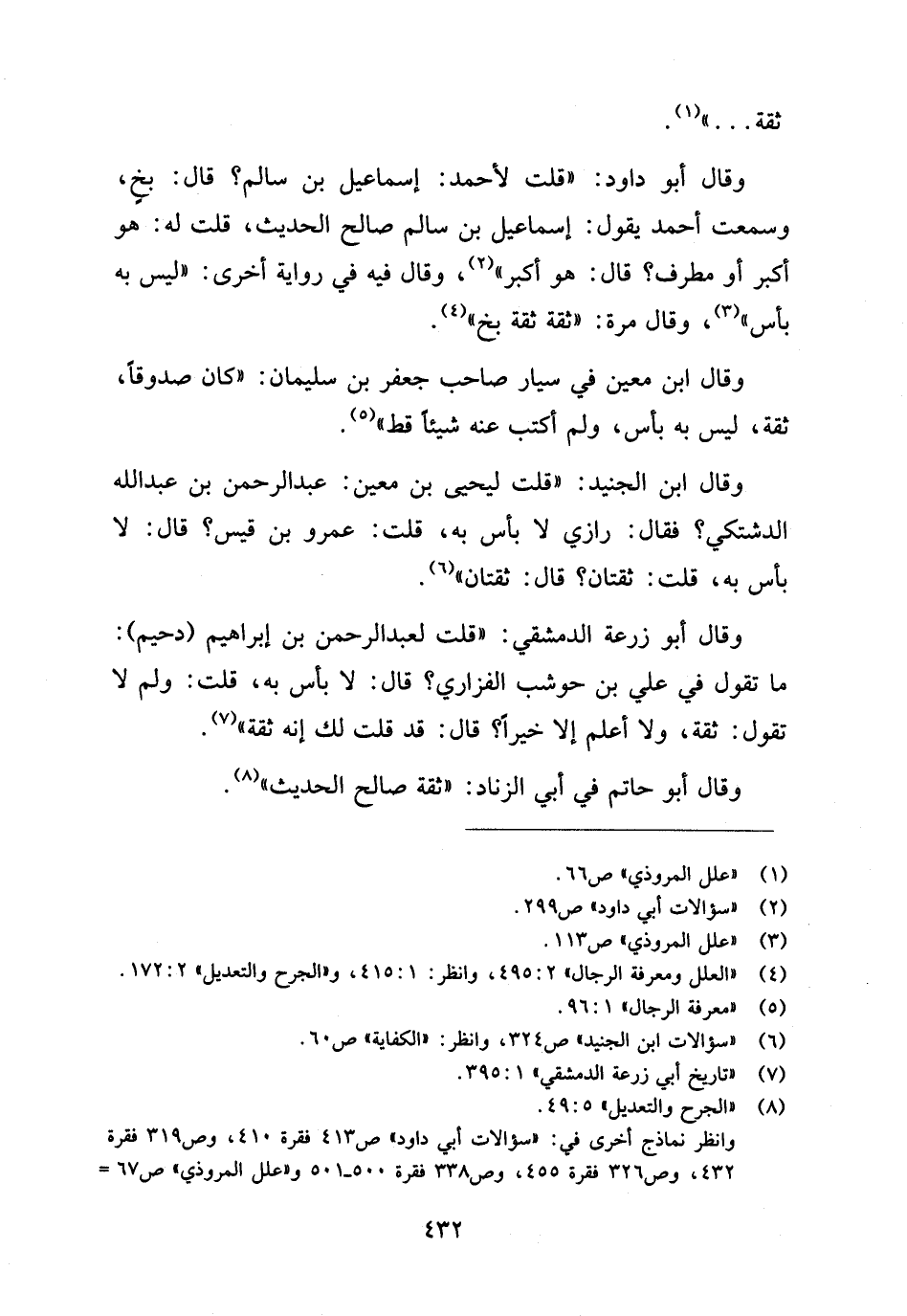 وانظر نماذج أخرى في: "سؤالات أبي داود" ص ٤١٣ فقرة ٤١٠، وص ٣١٩ فقرة ٤٣٢، وص ٣٢٦ فقرة ٤٥٥، وص ٣٣٨ فقرة ٥٠٠ - ٥٠١ و"علل المروذي" ص ٦٧ فقرة ٦٥ - ٦٦، وص ١١٦ فقرة ١٩٣، وص ١٢٨ فقرة ٢٢٥، وص ٢٠٥ فقرة ٣٧٥، ٣٧٧، وص ٢٠٧ فقرة ٣٨٥، وص ٢٠٨ فقرة ٣٨٦، وص ٢٢٧ فقرة ٤٤٠، وص ٢٤٨ فقرة ٥٠٢، و"سؤالات ابن الجنيد لابن معين" ص ٢٧٥ فقرة ١٦، وص ٢٨١ فقرة ٣٤، و"معرفة الرجال"١: ٩٢ فقرة ٣٥٠ - ٣٥١، وص ٩٣ فقرة ٣٥٩، وص ٩٤ فقرة ٣٩٦، ٣٧١ - ٣٧٢، وص ٩٥ فقرة ٣٧٤، وص ٩٧ فقرة ٤٠٥.
