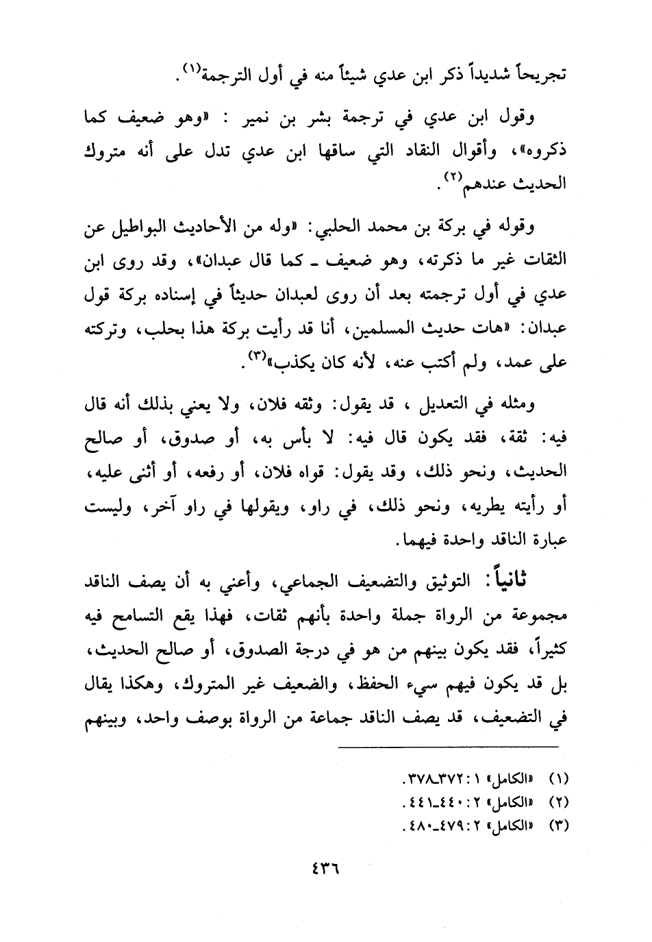 ثانيا: التوثيق والتضعيف الجماعي، وأعني به أن يصف الناقد مجموعة من الرواة جملة واحدة بأنهم ثقات، فهذا يقع التسامح فيه كثيرا، فقد يكون بينهم من هو في درجة الصدوق، أو صالح الحديث، بل قد يكون فيهم سيء الحفظ، والضعيف غير المتروك، وهكذا يقال في التضعيف، قد يصف الناقد جماعة من الرواة بوصف واحد، وبينهم