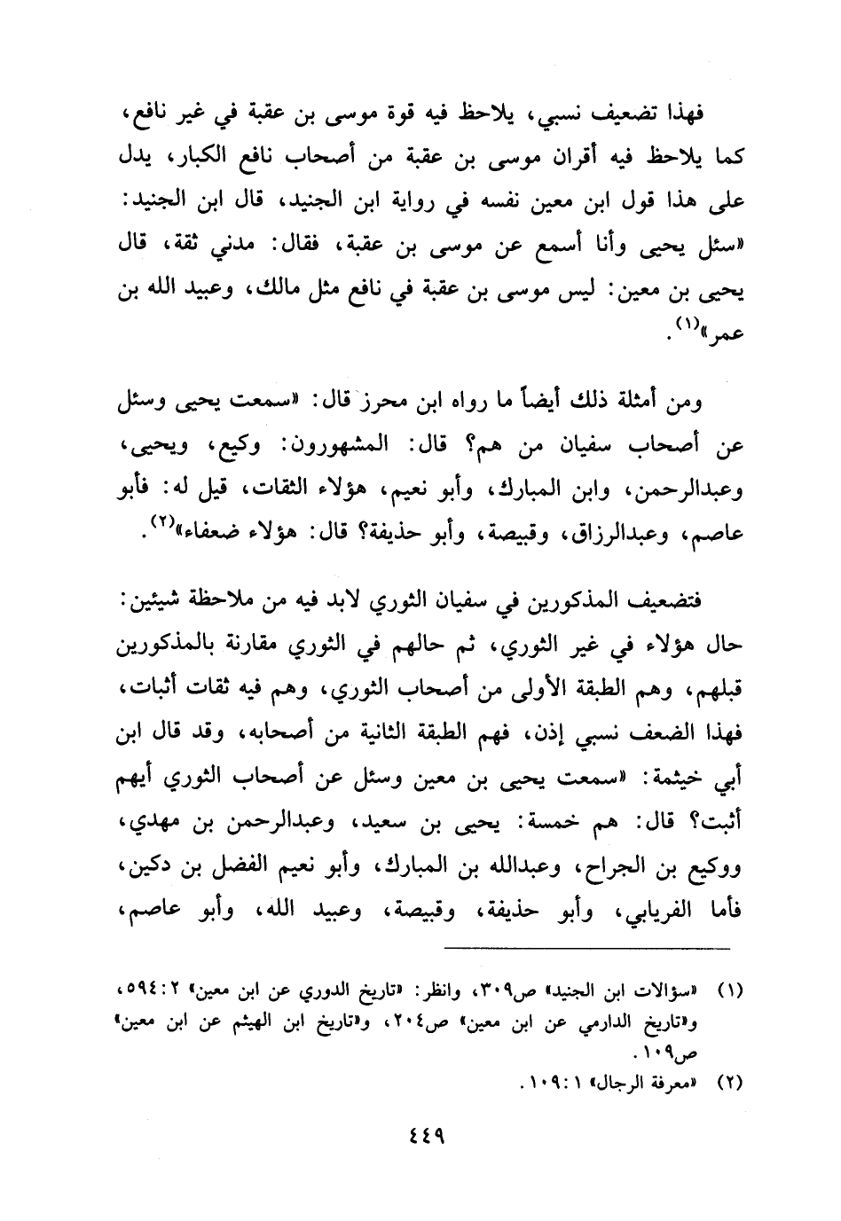 ومن أمثلة ذلك أيضا ما رواه ابن مُحْرِز قال: "سمعت يحيى وسئل عن أصحاب سفيان من هم؟ قال: المشهورون: وكيع، ويحيى، وعبد الرحمن، وابن المبارك، وأبو نُعَيْم، هؤلاء الثقات، قيل له: فأبو عاصم، وعبد الرزاق، وقَبِيْصَة، وأبو حذيفة؟ قال: هؤلاء ضعفاء" (¬٢).