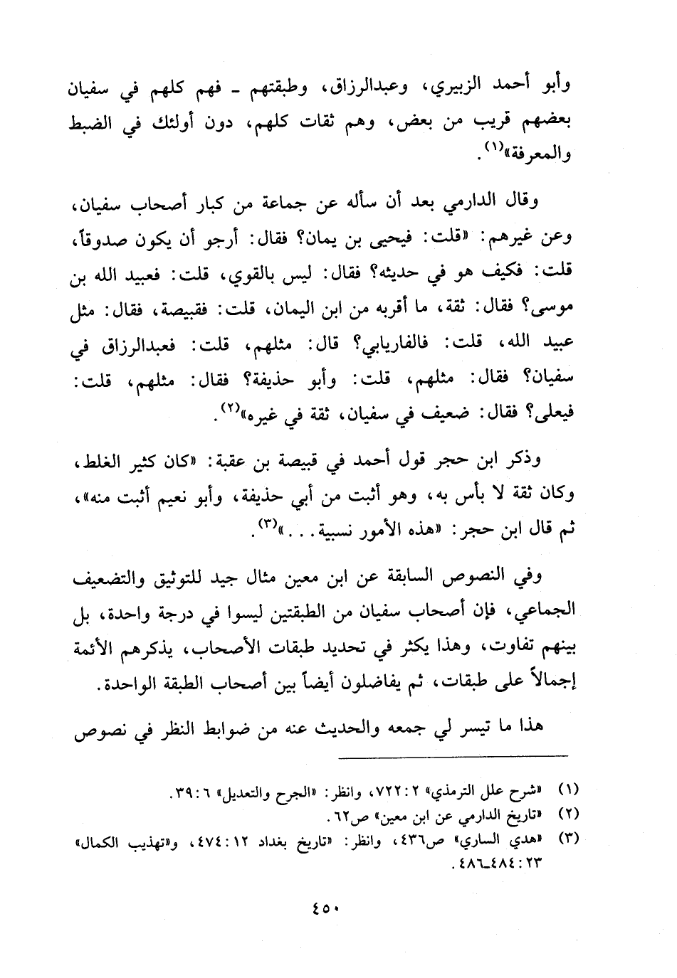 وفي النصوص السابقة عن ابن معين مثال جيد للتوثيق والتضعيف الجماعي، فإن أصحاب سفيان من الطبقتين ليسوا في درجة واحدة، بل بينهم تفاوت، وهذا يكثر في تحديد طبقات الأصحاب، يذكرهم الأئمة إجمالا على طبقات، ثم يفاضلون أيضا بين أصحاب الطبقة الواحدة.