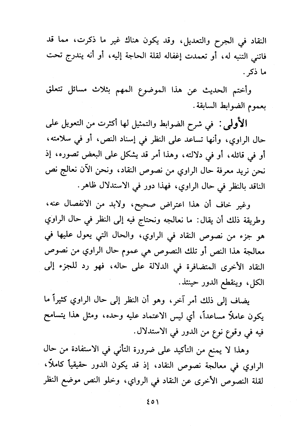 وغير خاف أن هذا اعتراض صحيح، ولابد من الانفصال عنه، وطريقة ذلك أن يقال: ما نعالجه ونحتاج فيه إلى النظر في حال الراوي هو جزء من نصوص النقاد في الراوي، والحال التي يُعَوَّل عليها في معالجة هذا النص أو تلك النصوص هي عموم حال الراوي من نصوص النقاد الأخرى المتضافرة في الدلالة على حاله، فهو رد للجزء إلى الكل، وينقطع الدور حينئذ.