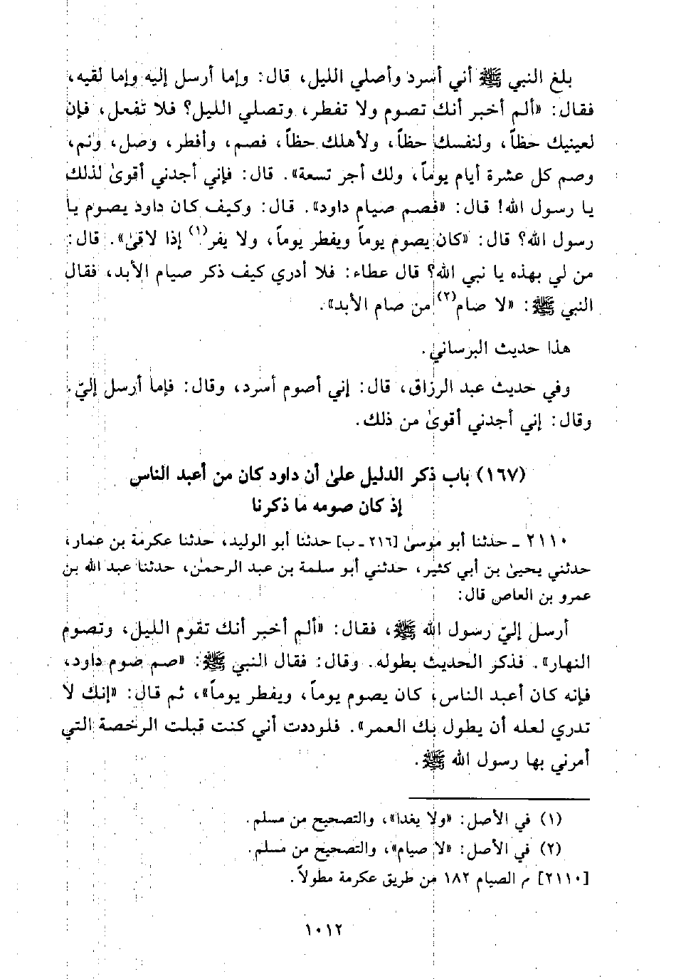 (167) بَاب ذِكْر الدَّلِيلِ عَلَى أَنَّ دَاوُدَ كَانَ مِنْ أَعْبَدِ النَّاسِ إِذ كَانَ صَوْمُهُ مَا ذَكَرْنَا