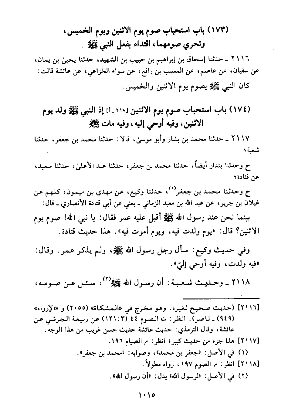 (174) بَاب اسْتِحْبَاب صَوْمِ يَوْمِ الِاثْنَيْنِ [217 - أ] إِذِ النَبِيّ - صَلَّى اللَّه عَلَيْهِ وَسَلَّمَ - وُلِدَ يَوْمُ الِاثْنَيْنِ، وَفِيهِ أُوحِيَ إِلَيْهِ، وَفِيهِ مَاتَ - صَلَّى اللَّه عَلَيْهِ وَسَلَّمَ