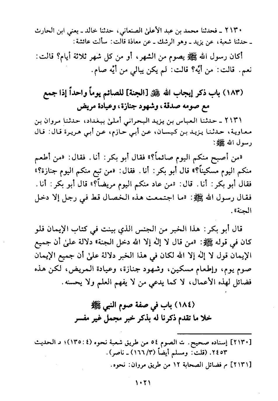 2130 - فَحَدَّثَنَا مُحَمَّدُ بْنُ عبد الْأَعْلَى الصَّنْعَانِيُّ، حَدَّثَنَا خَالِدٌ -يَعْنِي ابْنَ الْحَارِثِ- حَدَّثَنَا شُعْبَةُ، عَنْ يَزِيدَ -وَهُوَ الرِّشْكُ- عَنْ مُعَاذَةَ قَالَتْ: سَأَلْتُ عَائِشَة: