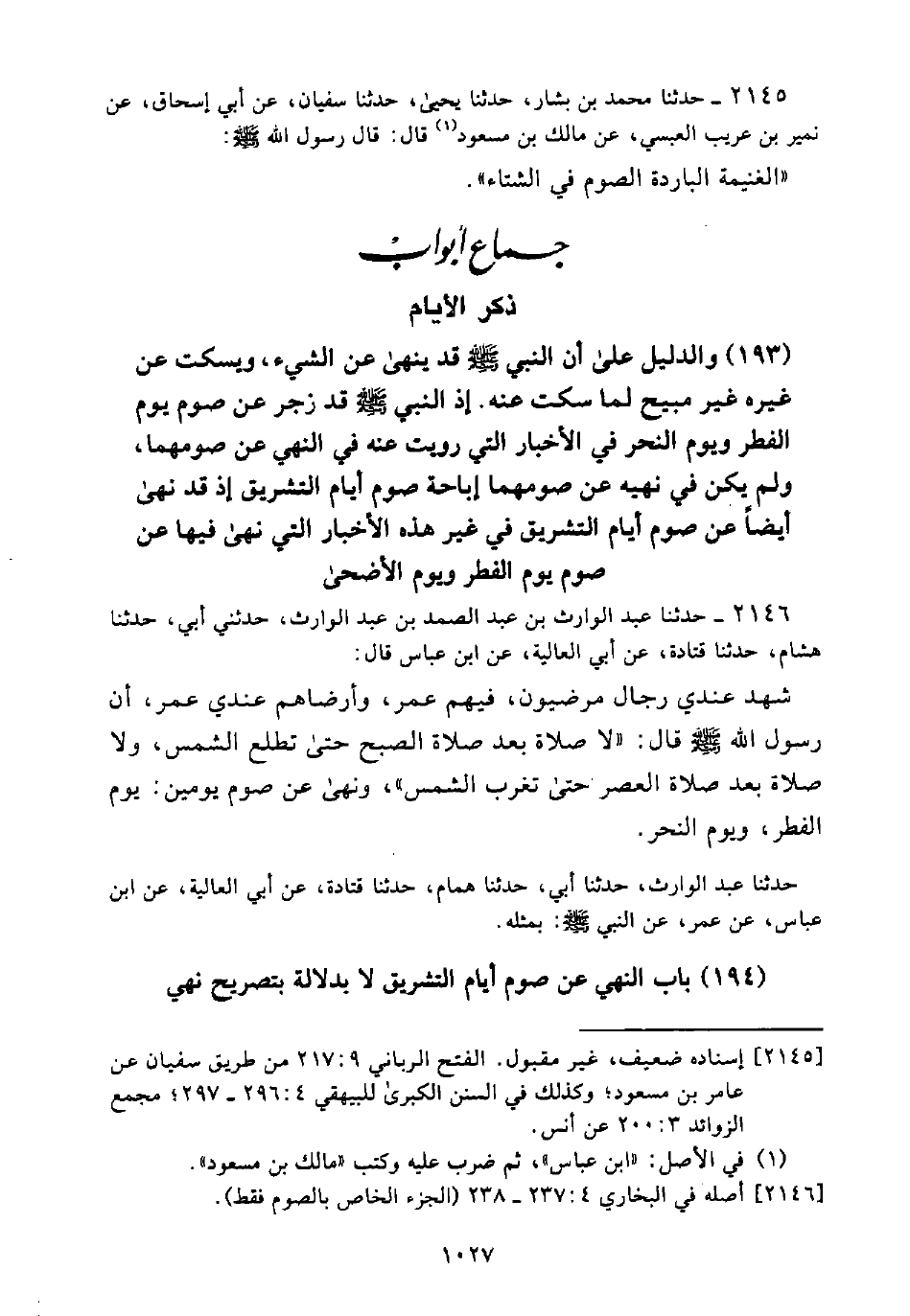(194) بَاب النَّهْيِ عَنْ صَوْمِ أَيَّامِ التَّشْرِيقِ بِدَلَالَةٍ بِتَصْرِيحِ نَهْيٍ