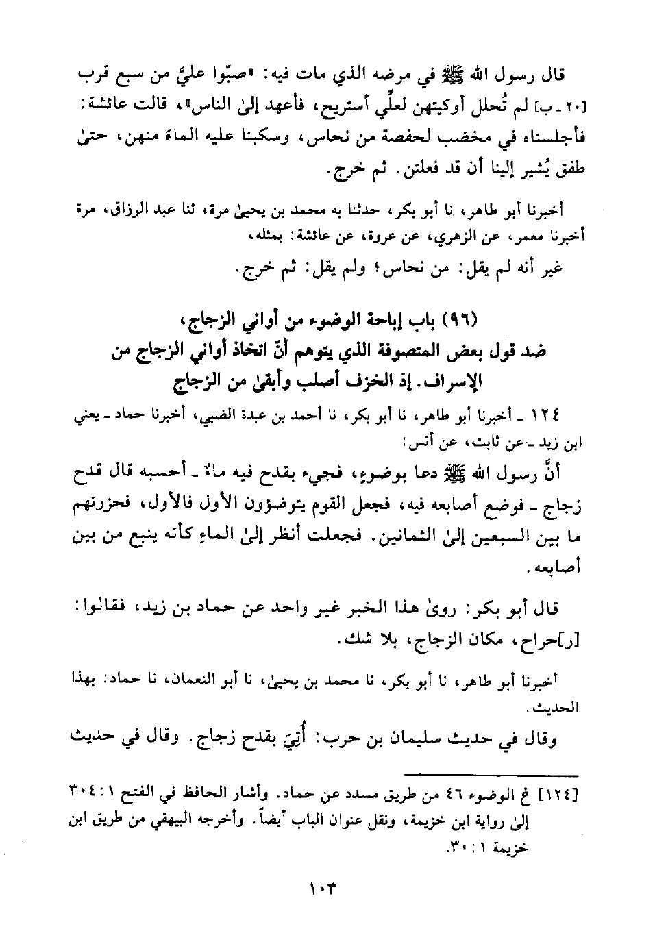 (96) بَابُ إِبَاحَةِ الْوُضُوءِ مِنْ أَوَانِي الزُّجَاجِ، ضِدُّ قَوْلِ بَعْضِ الْمُتَصَوِّفَةِ الَّذِي يَتَوَهَّمُ أَنَّ اتِّخَاذَ أَوَانِي الزُّجَاجِ مِنَ الْإِسْرَافِ. إِذِ الْخَزَفُ أَصْلَبُ وَأَبْقَى مِنَ الزُّجَاجِ