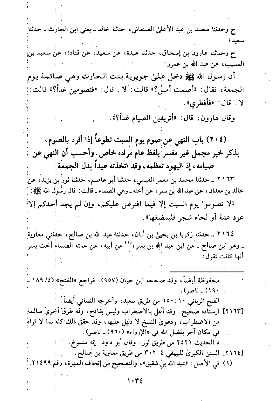 (204) بَاب النَّهْيِ عَنْ صَوْمِ يَوْمِ السَّبْتِ تَطَوُّعًا إِذَا أُفْرِدَ بِالصَّوْمِ، بِذِكْر خَبَر مُجْمَلٍ غَيْر مُفَسَّرٍ بِلَفْظٍ عَامٍّ مُرَادُهُ خَاصٌّ. وَأَحْسِبُ أَنَّ النَّهْيَ عَنْ صِيَامِهِ، إِذِ الْيَهُودُ تُعَظِّمُهُ، وَقَدِ اتَّخَذَتْهُ عِيدًا بَدَلَ الْجُمُعَةِ