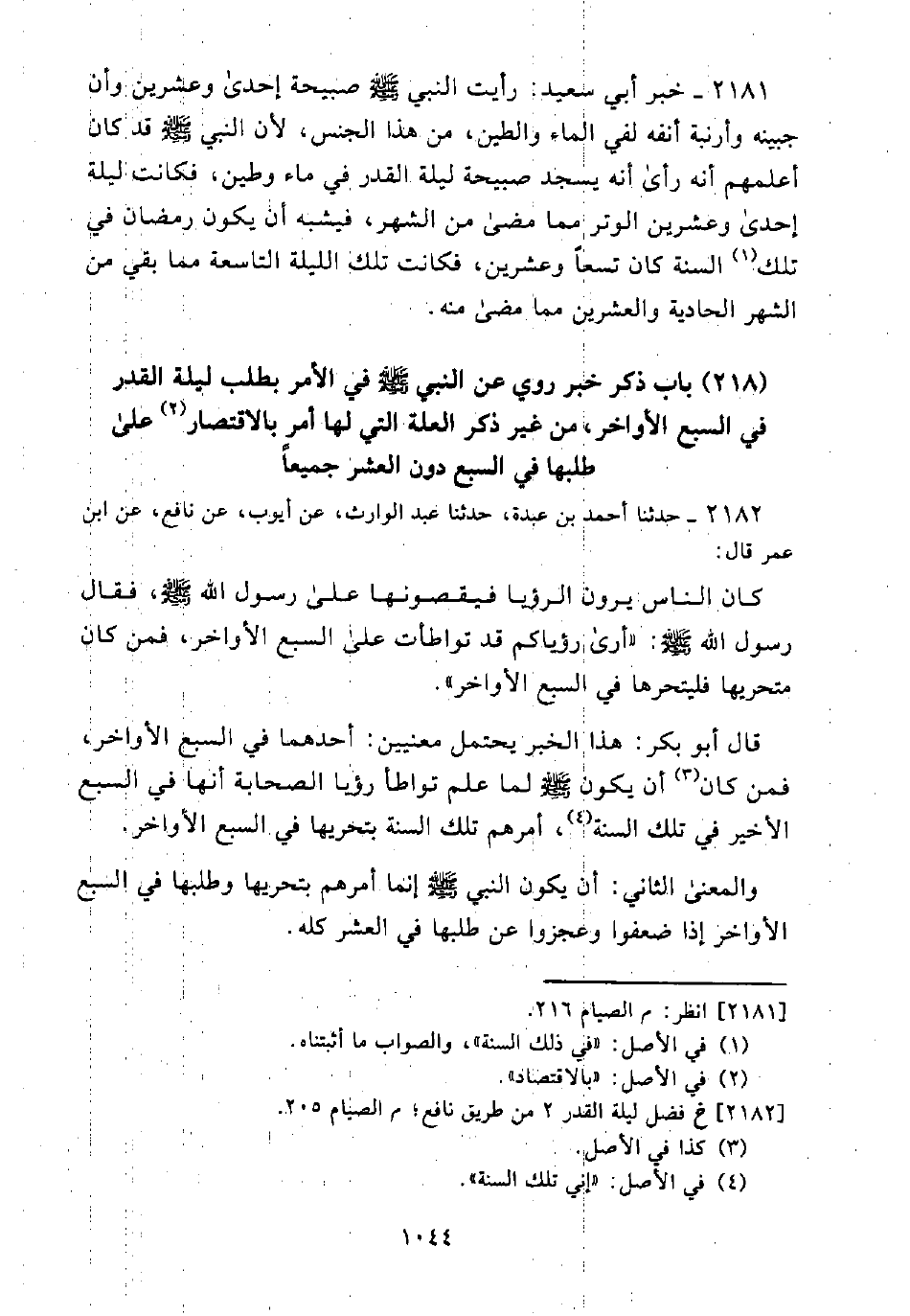 2181 - خَبَر أَبِي سَعِيدٍ: رَأَيْتُ النَبِيّ - صَلَّى اللَّه عَلَيْهِ وَسَلَّمَ - صَبِيحَةَ إِحْدَى وَعِشْرِينَ، وَأنَّ جَبِينَهُ وَأَرْنَبَةَ أَنْفِهِ لَفِي الْمَاءِ وَالطِّينِ، مِنْ هَذَا الْجِنْسِ، لِأَنَّ النَبِيّ - صَلَّى اللَّه عَلَيْهِ وَسَلَّمَ - قَدْ كَانَ أَعْلَمَهُمْ أَنَّهُ رَأَى أَنَّهُ يَسْجُدُ صَبِيحَةَ لَيْلَةِ الْقَدْرِ فِي مَاءٍ وَطِينٍ، فَكَانَتْ لَيْلَةُ إِحْدَى وَعِشْرِينَ الْوِتْرَ مِمَّا مَضَى مِنَ الشَّهْرِ، فَيُشْبِهُ أَنْ يَكُونَ رَمَضَانُ فِي تِلْكِ (¬1) السَّنَةِ كَانَ تِسْعًا وَعِشْرِينَ، فَكَانَتْ تِلْكَ اللَّيْلَةُ التَّاسِعَةُ مِمَّا بَقِيَ مِنَ الشَّهْرِ الْحَادِيَةَ وَالْعِشْرِينَ مِمَّا مَضَى مِنْهُ.