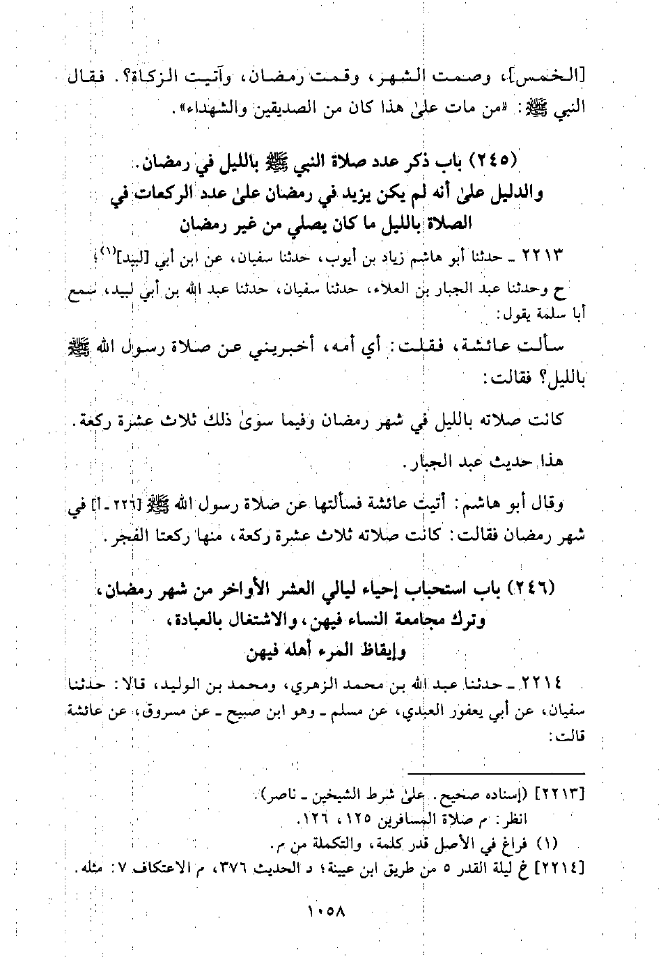 (245) بَاب ذِكْر عَدَدِ صَلَاةِ النَبِيّ - صَلَّى اللَّه عَلَيْهِ وَسَلَّمَ - بِاللَّيْلِ فِي رَمَضَانَ. وَالدَّلِيلِ عَلَى أَنَّهُ لَمْ يَكُنْ يَزِيدُ فِي رَمَضَانَ عَلَى عَدَدِ الرَّكَعَاتِ فِي الصَّلَاةِ بِاللَّيْلِ مَا كَانَ يُصَلِّي مِنْ غَيْر رَمَضَانَ