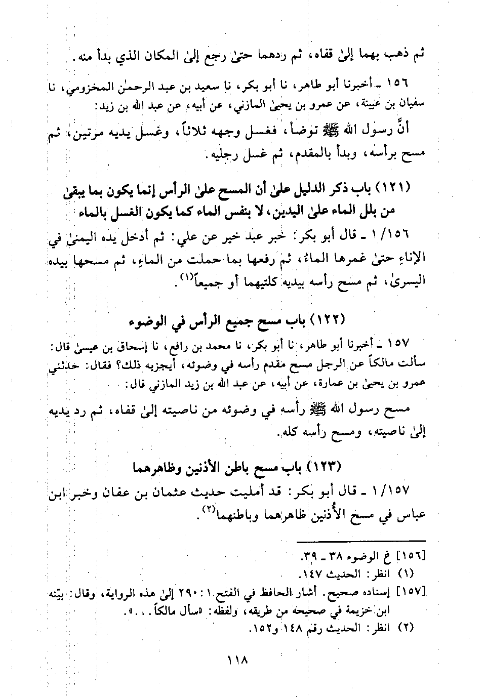 157/ 1 - قَالَ أَبُو بَكْرٍ: قَدْ أَمْلَيْتُ حَدِيثَ عُثْمَانَ بْنِ عَفَّانَ وَخَبَرَ ابْنِ عَبَّاسٍ فِي مَسْحِ الْأُذُنَيْنِ ظَاهِرِهِمَا وَبَاطِنِهِمَا (¬2).