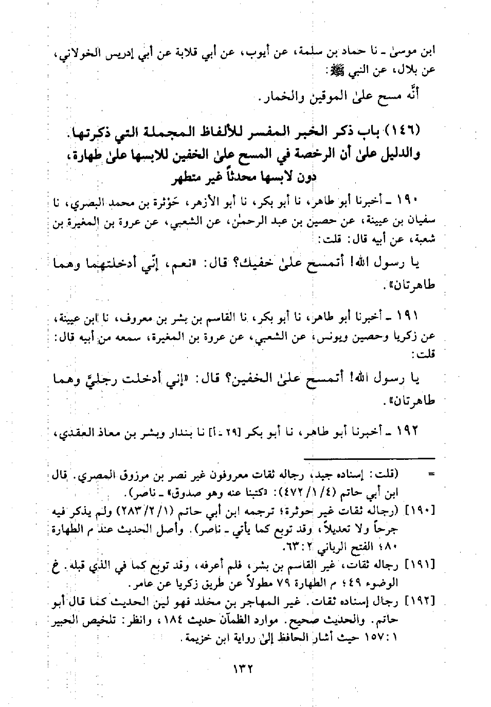 190 - أَخْبَرَنَا أَبُو طَاهِرٍ، نَا أَبُو بَكْرٍ، نَا أَبُو الْأَزْهَرِ، حَوْثَرَةُ بْنُ مُحَمَّدٍ الْبَصْرِيُّ، نَا سُفْيَانُ بْنُ عُيَيْنَةَ، عَنْ حُصَيْنِ بْنِ عَبْدِ الرَّحْمَنِ، عَنِ الشَّعْبِيِّ، عَنْ عُرْوَةَ بْنِ الْمُغِيرَةِ بْنِ شُعْبَةَ، عَنْ أَبِيهِ قَالَ: قُلْتُ: