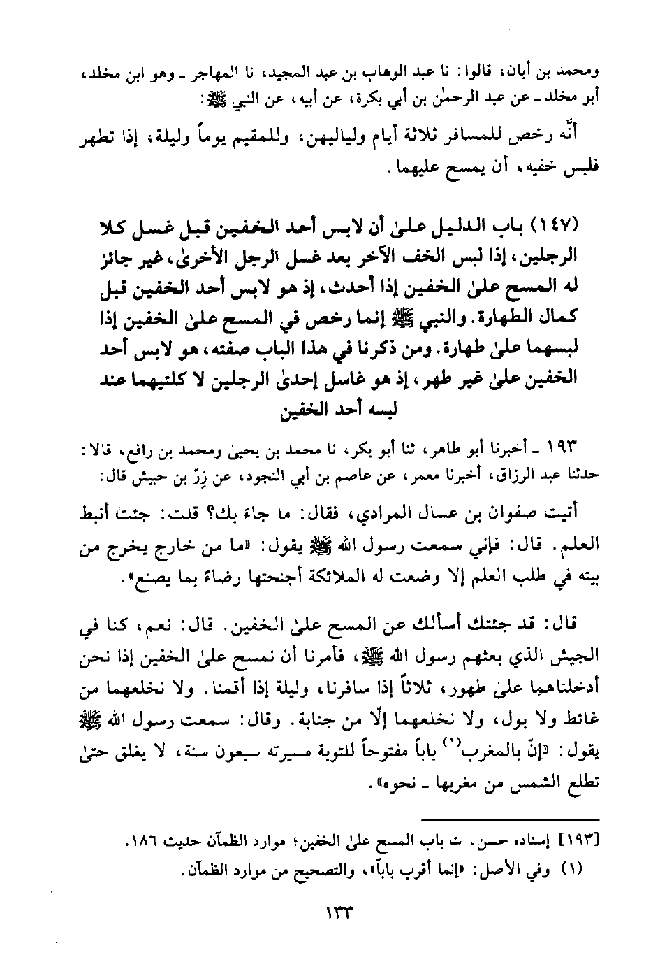 [193] إسناده حسن. ت باب المسح على الخفين؛ موارد الظمآن حديث 186.