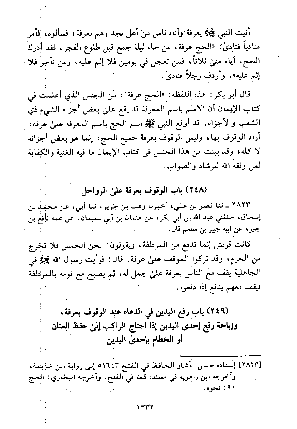 قَالَ أَبُو بَكْرٍ: هَذِهِ اللَّفْظَةُ: "الْحَجُّ عَرَفَةُ"، مِنَ الْجِنْسِ الَّذِي أَعْلَمْتُ فِي كِتَابِ الْإِيمَانِ أَنَّ الِاسْمَ بِاسْمِ الْمَعْرِفَةِ قَدْ يَقَعُ عَلَى بَعْضِ أَجْزَاءِ الشَّيْءِ ذِي الشُّعَبِ وَالْأَجْزَاءِ، قَدْ أَوْقَعَ النَّبِيُّ - صَلَّى اللَّهُ عَلَيْهِ وَسَلَّمَ - اسْمَ الْحَجَّ بِاسْمِ الْمَعْرِفَةِ عَلَى عَرَفَةَ، أَرَادَ الْوُقُوفَ بِهَا، وَلَيْسَ الْوُقُوفُ بِعَرَفَةَ جَمِيعَ الْحَجِّ، إِنَّمَا هُوَ بَعْضُ أَجْزَائِهِ لَا كُلُّهُ، وَقَدْ بَيَّنْتُ مِنْ هَذَا الْجِنْسِ فِي كِتَابِ الْإِيمَانِ مَا فِيهِ الْغُنيَة وَالْكِفَايَةِ لِمَنْ وَفَّقَهُ اللَّهُ لِلرَّشَادِ وَالصَّوَابِ.
