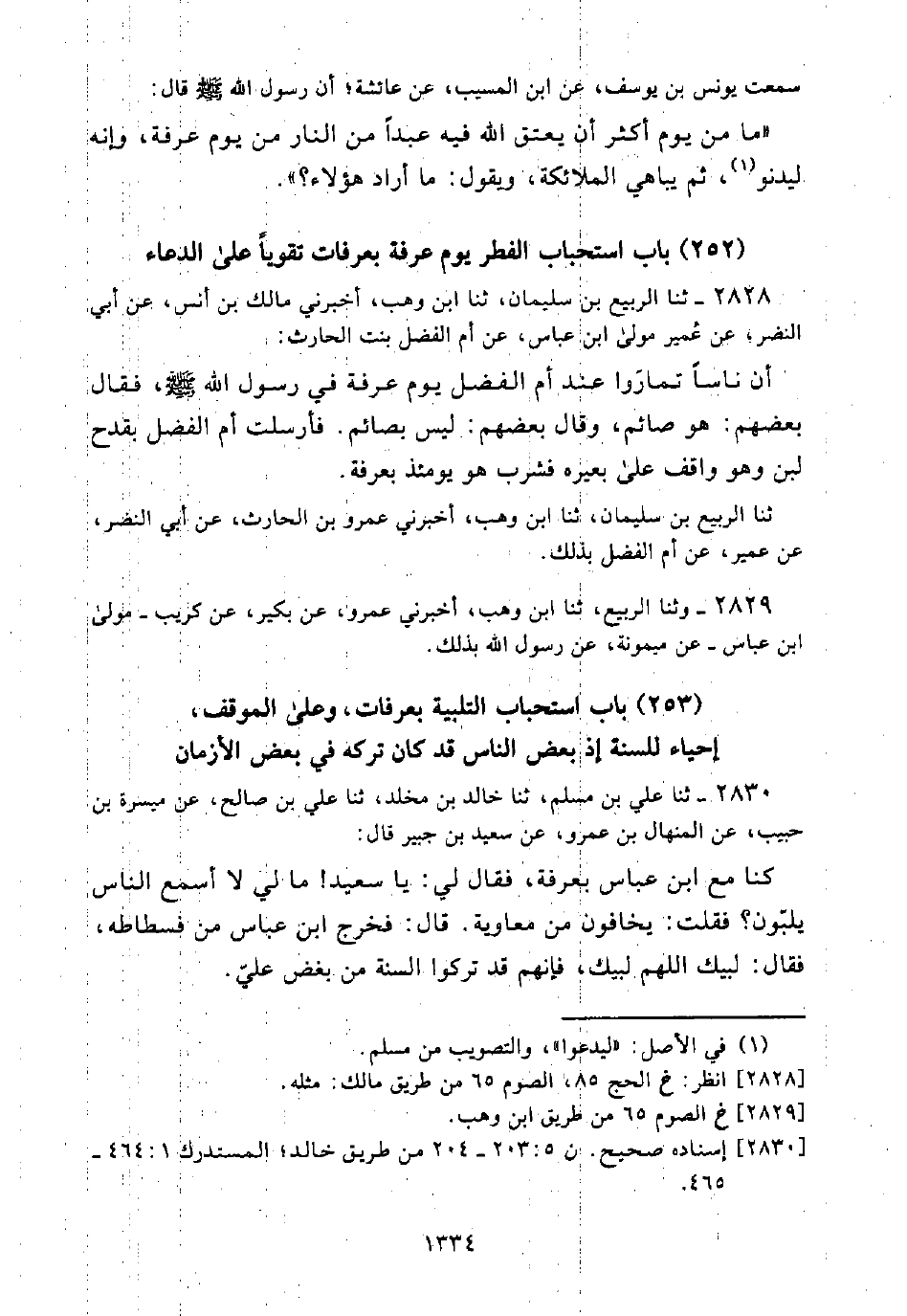 (253) بَابُ اسْتِحْبَابِ التَّلْبِيَةِ بِعَرَفَاتٍ، وَعَلَى الْمَوْقِفِ، إِحْيَاءً لِلسُّنَّةِ إِذْ بَعْضُ النَّاسِ قَدْ كَانَ تَرَكَهُ فِي بَعْضِ الْأَزْمَانِ