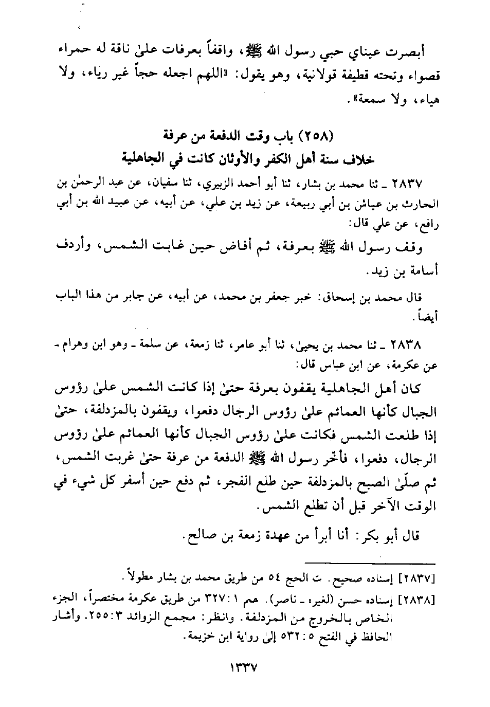 (258) بَابُ وَقْتِ الدَّفْعَةِ مِنْ عَرَفَةَ خِلَافَ سُنَّةِ أَهْلِ الْكُفْرِ وَالْأَوْثَانِ كَانَتْ فِي الْجَاهِلِيَّةِ