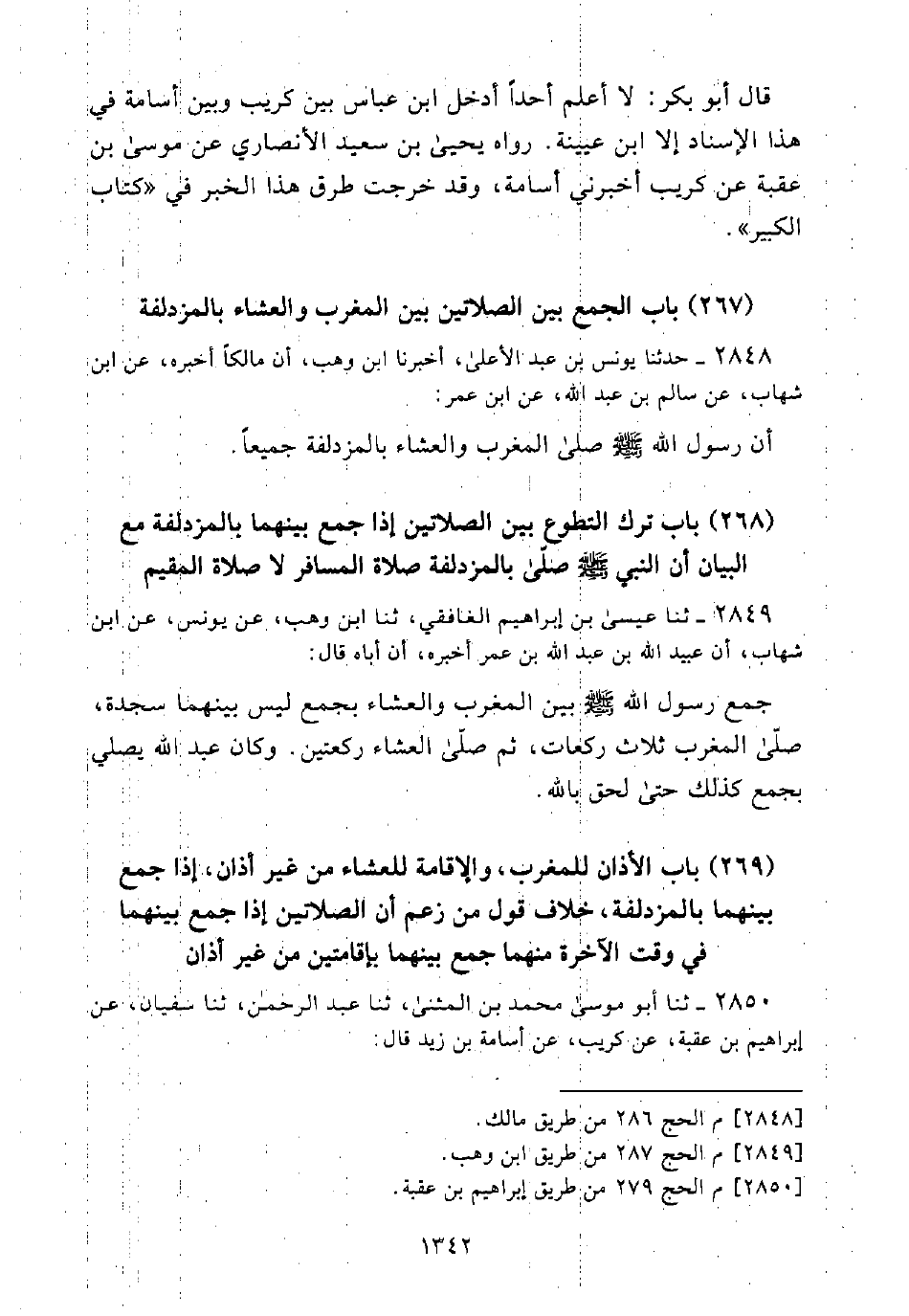 (267) بَابُ الْجَمْعِ بَيْنَ الصَّلَاتَيْنِ بَيْنَ الْمَغْرِبِ وَالْعِشَاءِ بِالْمُزْدَلِفَةِ