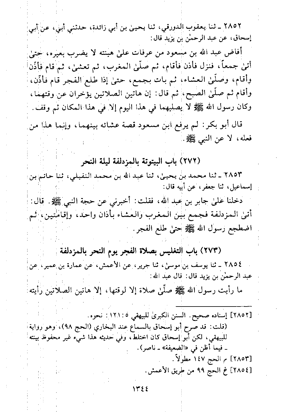 أَفَاضَ عَبْدُ اللَّهِ بْنُ مَسْعُودٍ مِنْ عَرَفَاتٍ عَلَى هِينَتِهِ لَا يَضْرِبُ بَعِيرَهُ، حَتَّى أَتَى جَمْعًا، فَنَزَلَ فَأَذَّنَ فَأَقَامَ، ثُمَّ صَلَّى الْمَغْرِبَ، ثُمَّ تَعَشَّى، ثُمَّ قَامَ فَأَذَّنَ وَأَقَامَ، وَصَلَّى الْعِشَاءَ، ثُمَّ بَاتَ بِجَمْعٍ، حَتَّى إِذَا طَلَعَ الْفَجْرُ قَامَ فَأَذَّنَ، وَأَقَامَ ثُمَّ صَلَّى الصُّبْحَ، ثُمَّ قَالَ: "إِنَّ هَاتَيْنِ الصَّلَاتَيْنِ يُؤَخَّرَانِ عَنْ وَقْتِهِمَا، وَكَانَ رَسُولُ اللَّهِ - صَلَّى اللَّهُ عَلَيْهِ وَسَلَّمَ - لَا يُصَلِّيهما فِي هَذَا الْيَوْمِ إِلَّا فِي هَذَا الْمَكَانِ ثُمَّ وَقَفَ.
