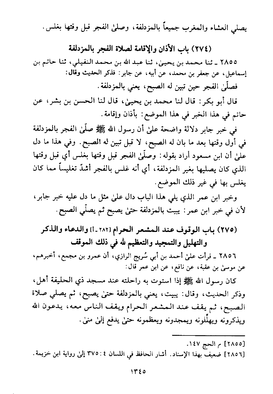 وَخَبَرُ ابْنِ عُمَرَ الَّذِي يَلِي هَذَا الْبَابَ دَال عَلَى مِثْلِ مَا دَلَّ عَلَيْهِ خَبَرُ جَابِرٍ، لِأَنَّ فِي خَبَرِ ابْنِ عُمَرَ: يَبِيتُ بِالْمُزْدَلِفَةِ حَتَّى يُصْبِحَ ثُمَّ يُصَلِّيَ الصُّبْحَ.