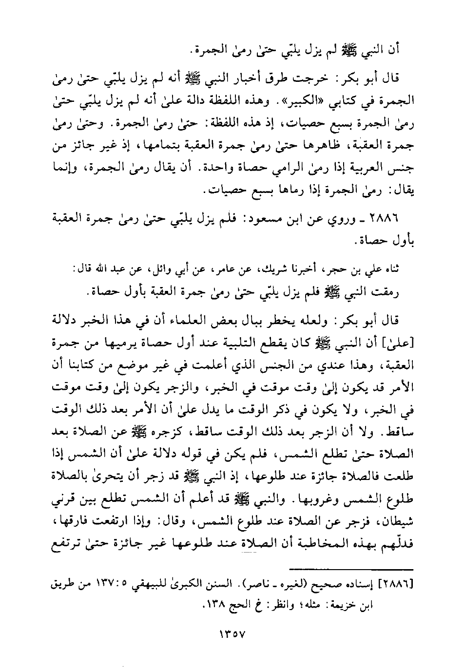 قَالَ أَبُو بَكْرٍ: خَرَّجْتُ طُرُقَ أَخْبَارِ النَّبِيِّ - صَلَّى اللَّهُ عَلَيْهِ وَسَلَّمَ - أَنَّهُ لَمْ يَزَلْ يُلَبِّي حَتَّى رَمَى الْجَمْرَةَ فِي كِتَابِي "الْكَبِيرِ". وَهَذِهِ اللَّفْظَةُ دَالَّةٌ عَلَى أَنَّهُ لَمْ يَزَلْ يُلَبِّي حتى رَمى الْجَمْرَة بِسَبْعِ حَصَيَاتٍ، إِذْ هَذِهِ اللَّفْظَةُ: حَتَّى رَمَى الْجَمْرَةَ. وَحَتَّى رَمَى جَمْرَةَ الْعَقَبَةِ، ظَاهِرُهَا حَتَّى رَمَى جَمْرَةَ الْعَقَبَةِ بِتَمَامِهَا، إِذْ غَيْرُ جَائِزٍ مِنْ جِنْسِ الْعَرَبِيَّةِ إِذَا رَمَى الرَّامِي حَصَاةً وَاحِدَةً. أَنْ يُقَالَ رَمَى الْجَمْرَةَ، وَإِنَّمَا يُقَالُ: رَمَى الْجَمْرَةَ إِذَا رَمَاهَا بِسَبْعِ حَصَيَاتٍ.