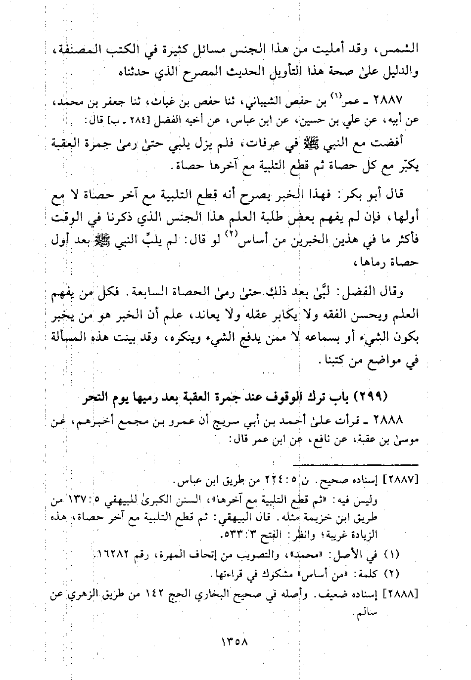 وليس فيه: "ثم قطع التلبية مع آخرها"، السنن الكبرى للبيهقي 5: 137 من ابن خزيمة مثله. قال البيهقي: تم قطع التلبية مع آخر حصاة، هذه الزيادة غريبة، وانظر: الفتح 3: 533.