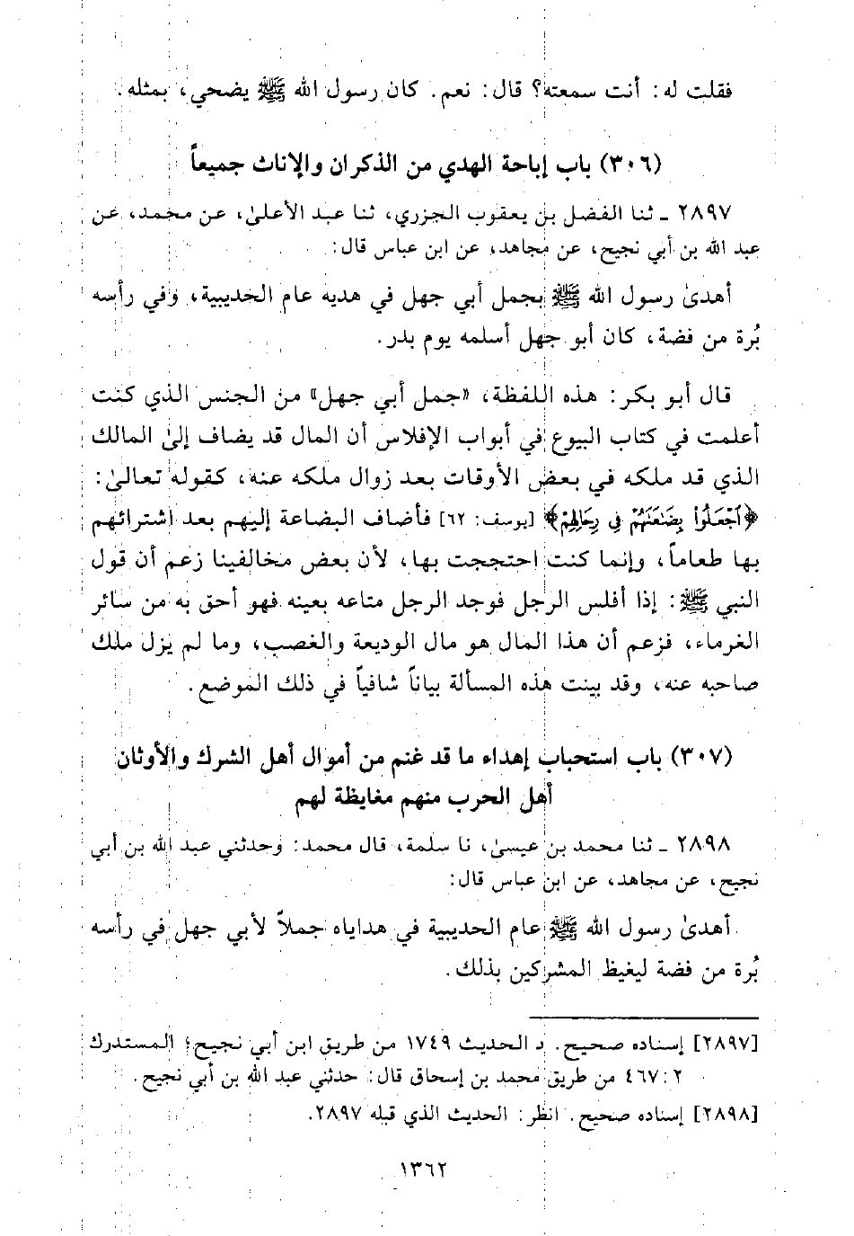 أَهْدَى رَسُولُ اللَّهِ - صَلَّى اللَّهُ عَلَيْهِ وَسَلَّمَ - بِجَمَلِ أَبِي جَهْلٍ فِي هَدْيِهِ عَامَ الْحُدَيْبِيَةِ، وَفِي رَأْسِهِ بُرَّةٌ مِنْ فِضَّةٍ، كَانَ أَبُو جَهْلٍ أَسْلَمَهُ يَوْمَ بَدْرٍ.
