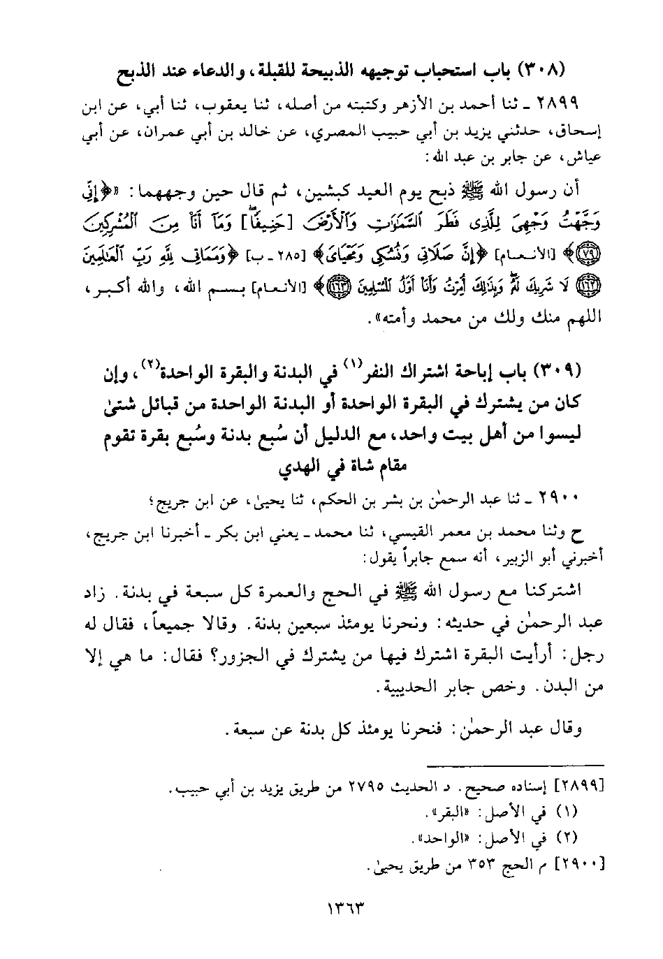 أَنَّ رَسُولَ اللَّهِ - صَلَّى اللَّهُ عَلَيْهِ وَسَلَّمَ - ذَبَحَ يَوْمَ الْعِيدِ كَبْشَيْنِ، ثُمَّ قَالَ حِينَ وَجَّهَهُمَا: " (إِنِّي وَجَّهْتُ وَجْهِيَ لِلَّذِي فَطَرَ السَّمَاوَاتِ وَالْأَرْضَ [حَنِيفًا] وَمَا أَنَا مِنَ الْمُشْرِكِينَ) [الأنعام: 79] (إِنَّ صَلَاتِي وَنُسُكِي وَمَحْيَايَ) [285 - ب] (وَمَمَاتِي لِلَّهِ رَبِّ الْعَالَمِينَ (162) لَا شَرِيكَ لَهُ وَبِذَلِكَ أُمِرْتُ وَأَنَا أَوَّلُ الْمُسْلِمِينَ) [الأنعام: 163] بِاسْمِ اللَّهِ، واللَّهُ أَكْبَرُ، اللَّهُمَّ مِنْكَ وَلَكَ مِنْ مُحَمَّدٍ وَأُمَّتِهِ".