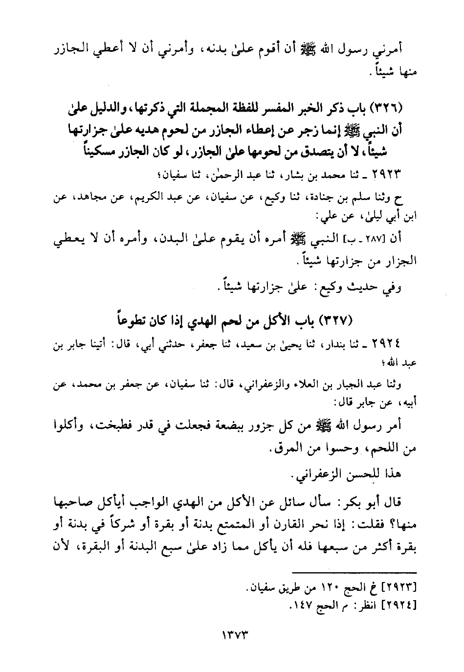 2924 - ثَنَا بُنْدَارٌ، ثَنَا يَحْيَى بْنُ سَعِيدٍ، ثَنَا جَعْفَرٌ، حَدَّثَنِي أَبِي، قَالَ: أَتَيْنَا جَابِرَ بْنَ عَبْدِ اللَّهِ؛ وَثَنَا عَبْدُ الْجَبَّارِ بْنُ الْعَلَاءِ وَالزَّعْفَرَانِيُّ، قَالَ: ثَنَا سُفْيَانُ، عَنْ جَعْفَرِ بْنِ مُحَمَّدٍ، عَنْ أَبِيهِ، عَنْ جَابِرٍ قَالَ: أَمَرَ رَسُولُ اللَّهِ - صَلَّى اللَّهُ عَلَيْهِ وَسَلَّمَ - مِنْ كُلِّ جَزُورٍ بِبَضْعَةٍ فَجُعِلَتْ فِي قِدْرٍ فَطُبِخَتْ، وَأَكَلُوا مِنَ اللَّحْمِ، وَحَسَوْا مِنَ الْمَرَقِ.